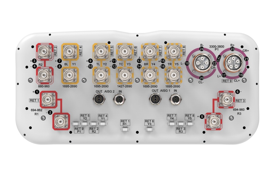 24-port sector antenna, 2x 694-862 (R1), 2x 880-960 (R2), 2x 694-960 (R3), 8x 1695-2690 (Y1-Y2/Y4-Y5) & 2x 1427-2690 (Y3) MHz, 65° HPBW and 8x 3300-3800 (P1) MHz, 90° HPBW, 9x RET.