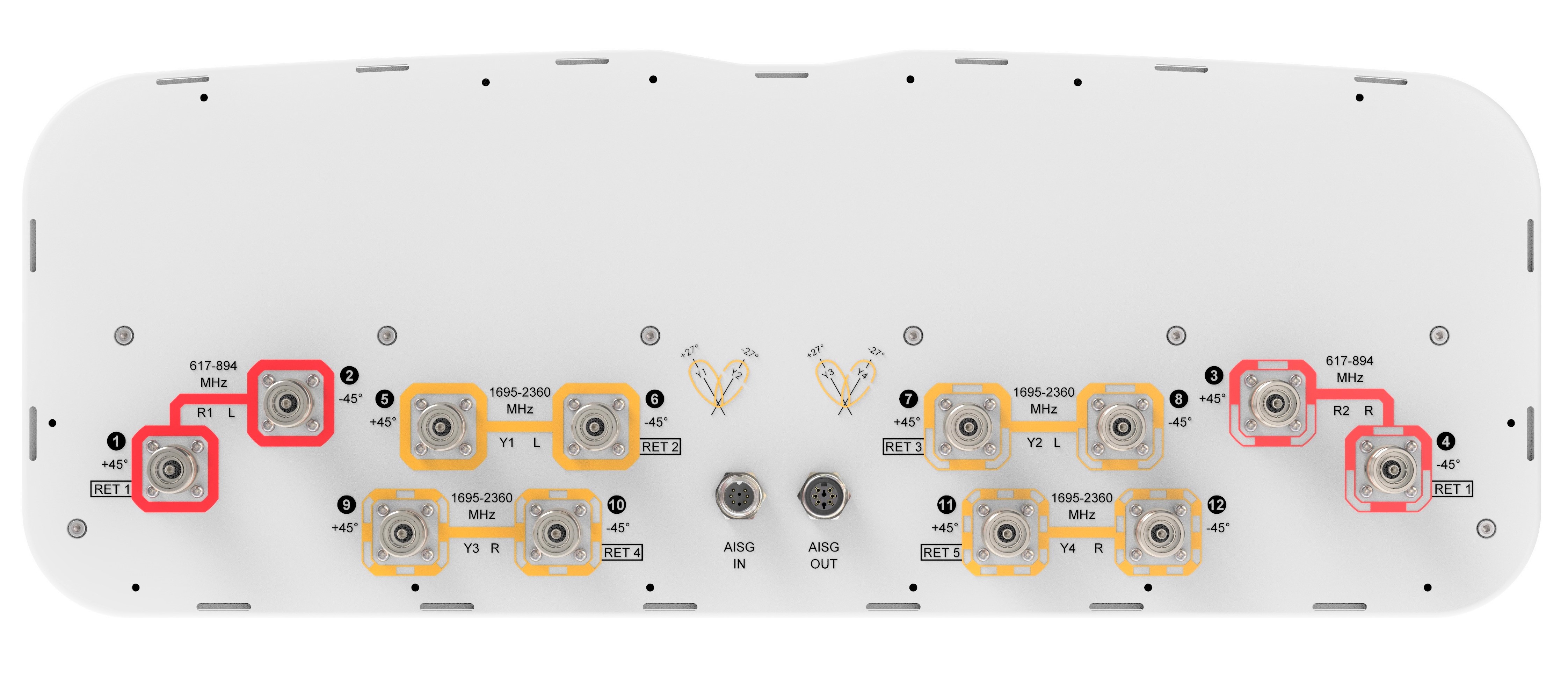 12-Port Sector/multibeam antenna, 4x 617–894 MHz 65° HPBW and 8x 1695–2360 MHz 4x 33° HPBW, 5x RET