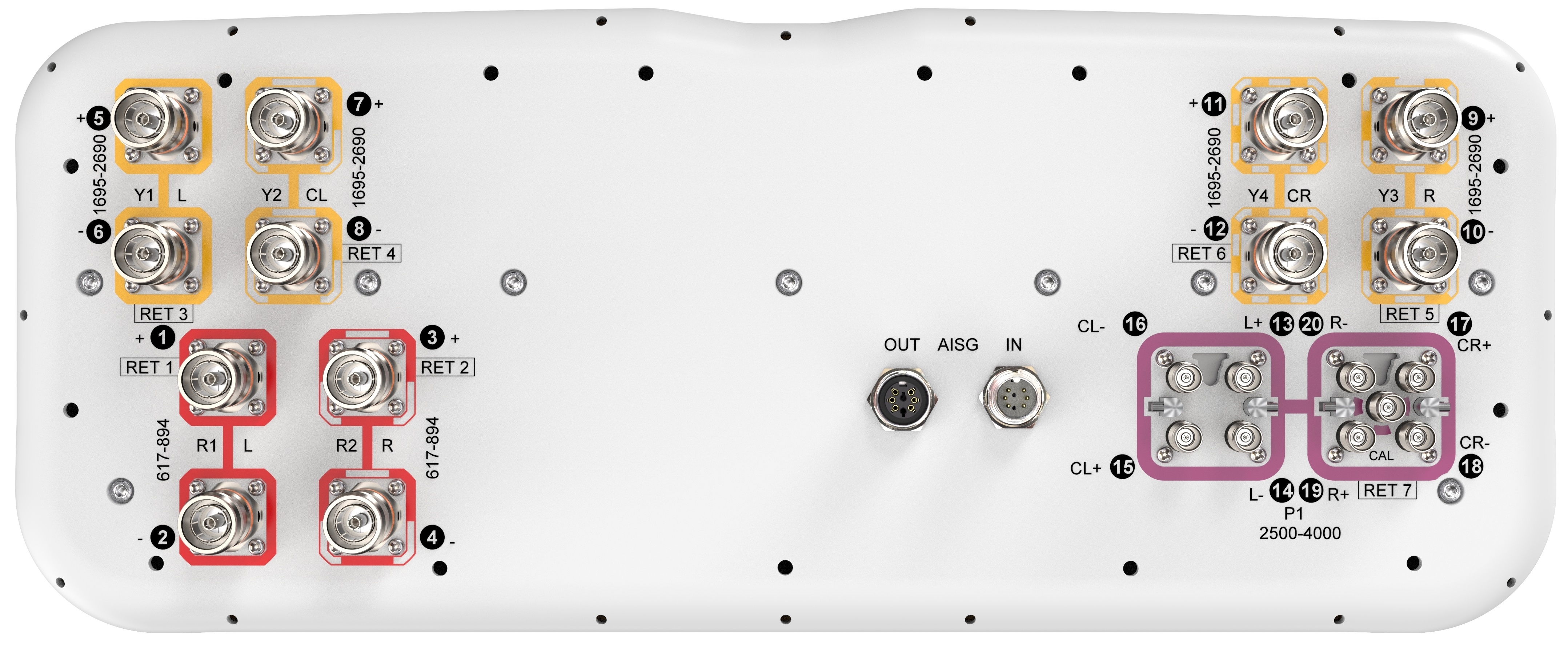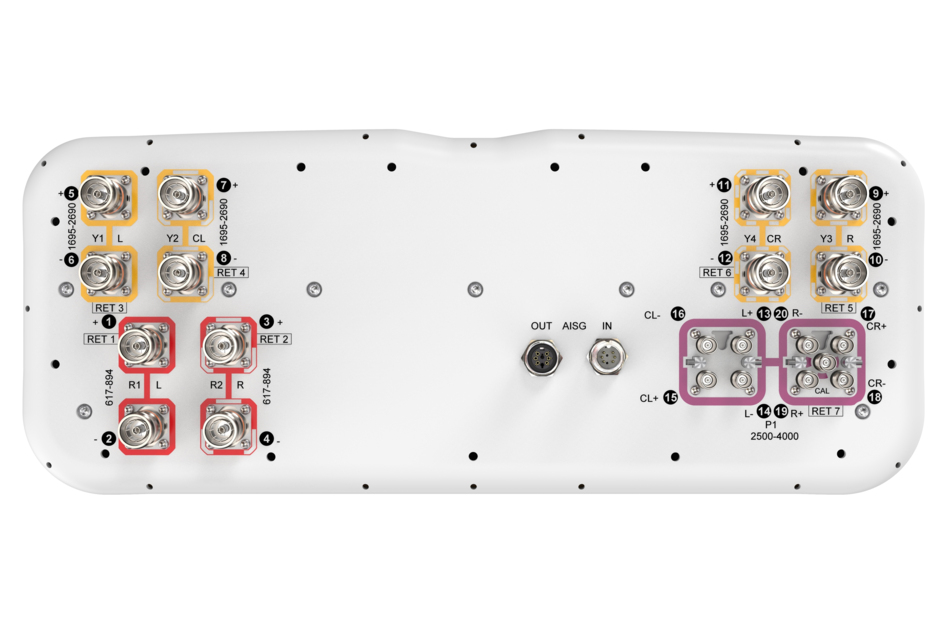 20-port sector antenna, 4x 617-894, 8x 1695-2690 MHz 65° HPBW and 8x 2500-4000 MHz, Beamformer, 7x RET