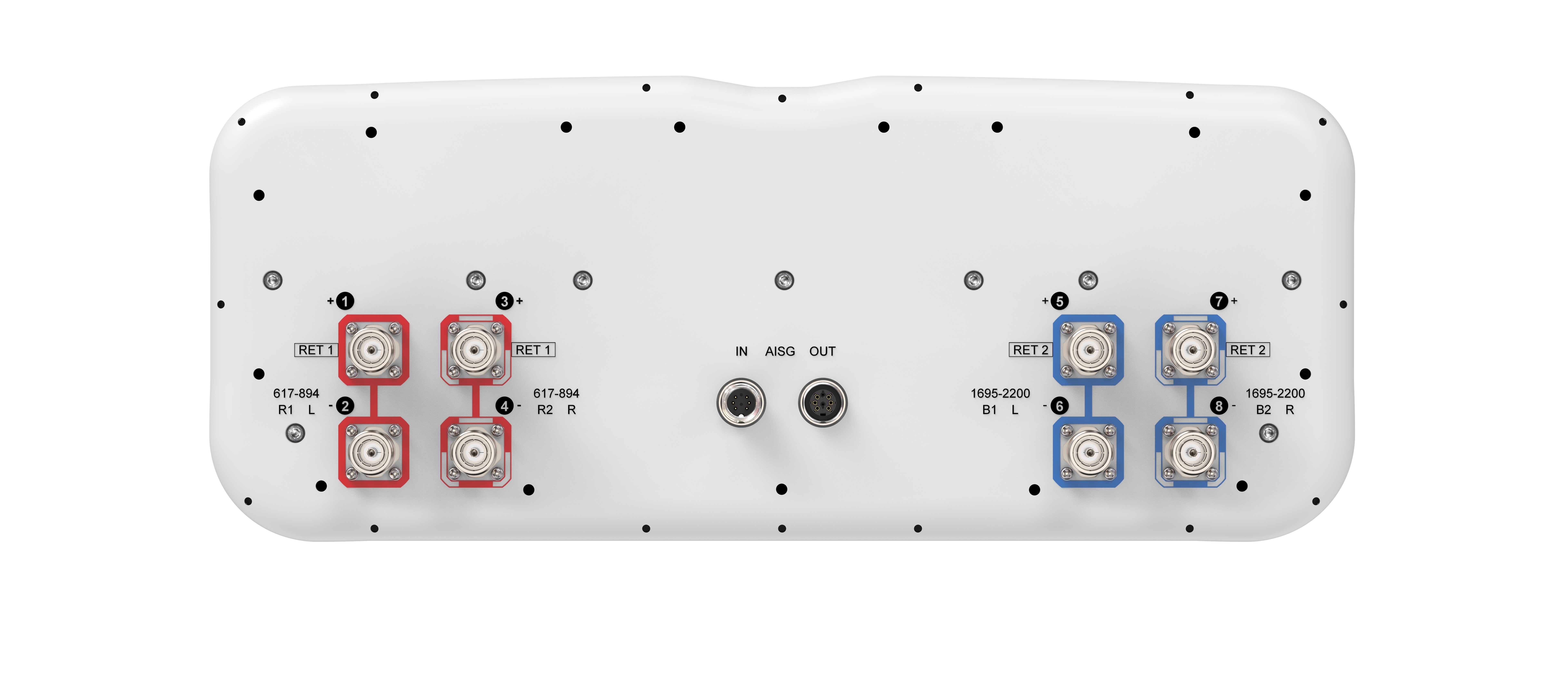 - Antenna includes 2×Single Column X-Pol Arrays for 617-894MHz and 2×Single Column X-Pol Arrays for 1695-2200MHz
