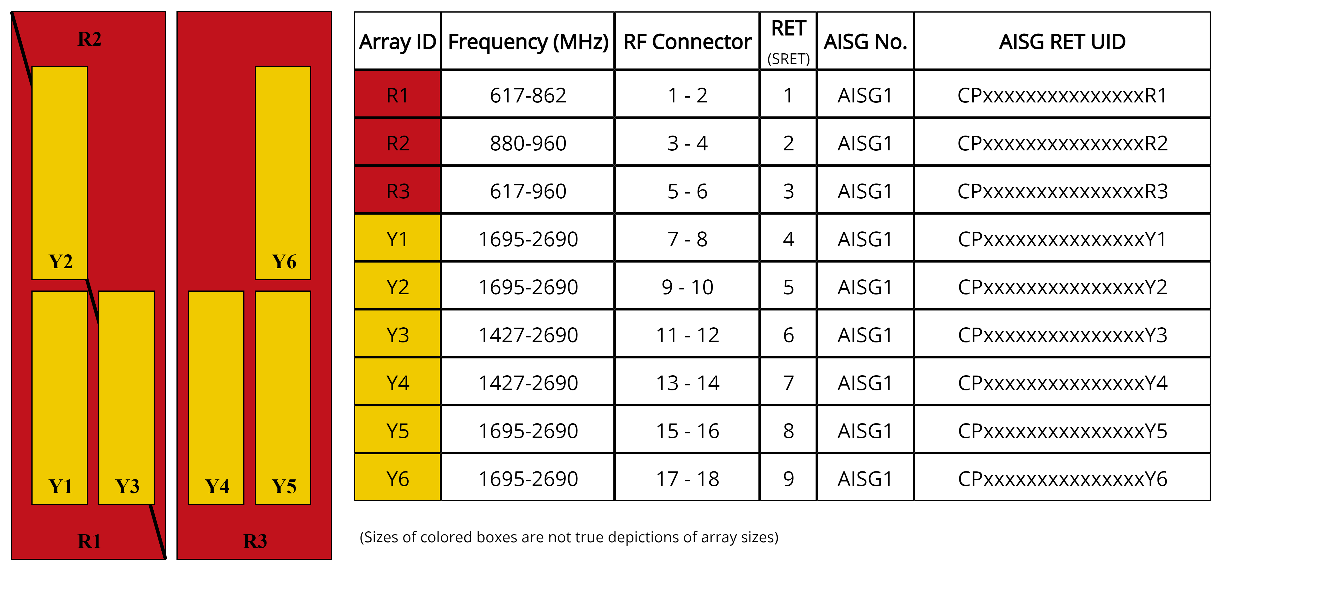 18-port sector antenna, 2x 617-862 (R1), 2x 880-960 (R2), 2x 617-960 (R3), 4x 1427-2690 (Y3,Y4) & 8x 1695-2690 (Y1,Y2,Y5,Y6) MHz, 65° HPBW, 9x RET. All Internal RET actuators are connected in “Cascaded SRET” configuration