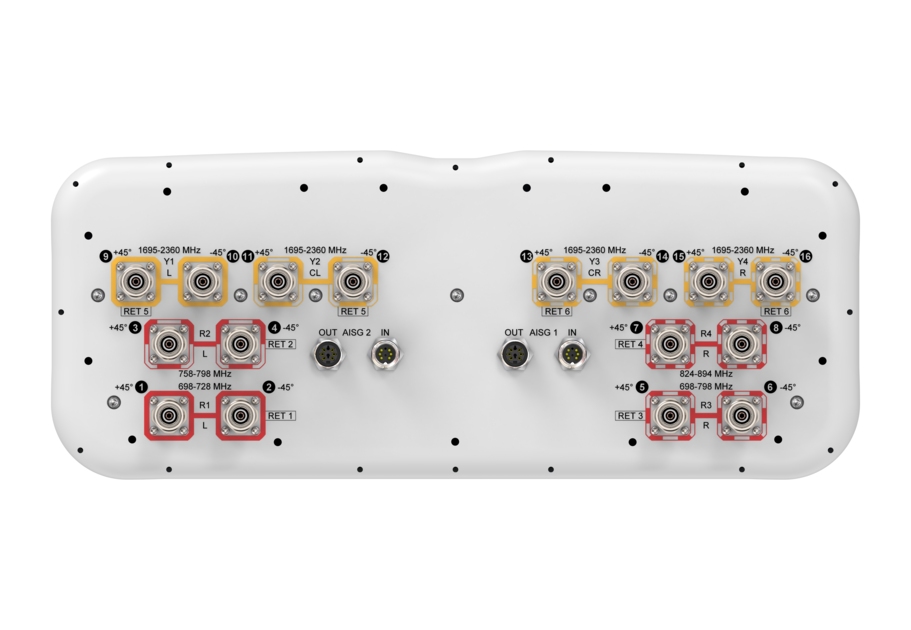 16-port, low band diplexed antenna, 2x 698-728 MHz, 2x758-798 MHz, 2 x 698-798 MHz, 2 x 824-894 MHz and 8 x 1695-2360 MHz, 65° HPBW, 6 x RET
