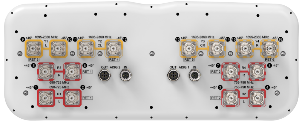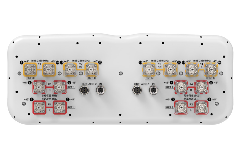16-port, low band diplexed antenna, 4 x 698-728 MHz, 4 x 758-798 MHz and 8 x 1695-2360 MHz, 65° HPBW, 6 x RET