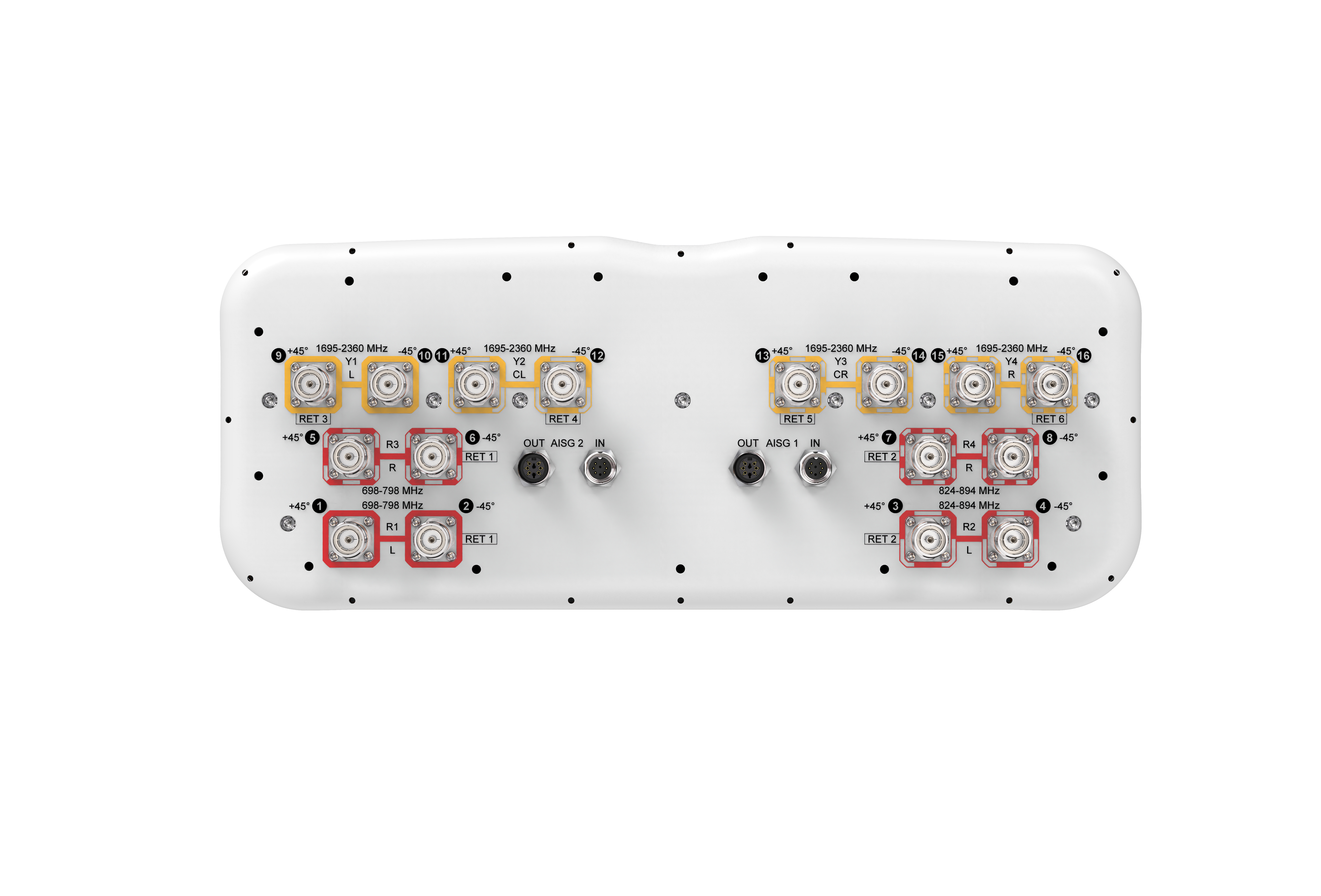8 ft, 16-port, low band diplexed antenna, 4 x 698-798 MHz, 4 x 824-894 MHz and 8 x 1695-2360 MHz, 65° HPBW, 6 x RET