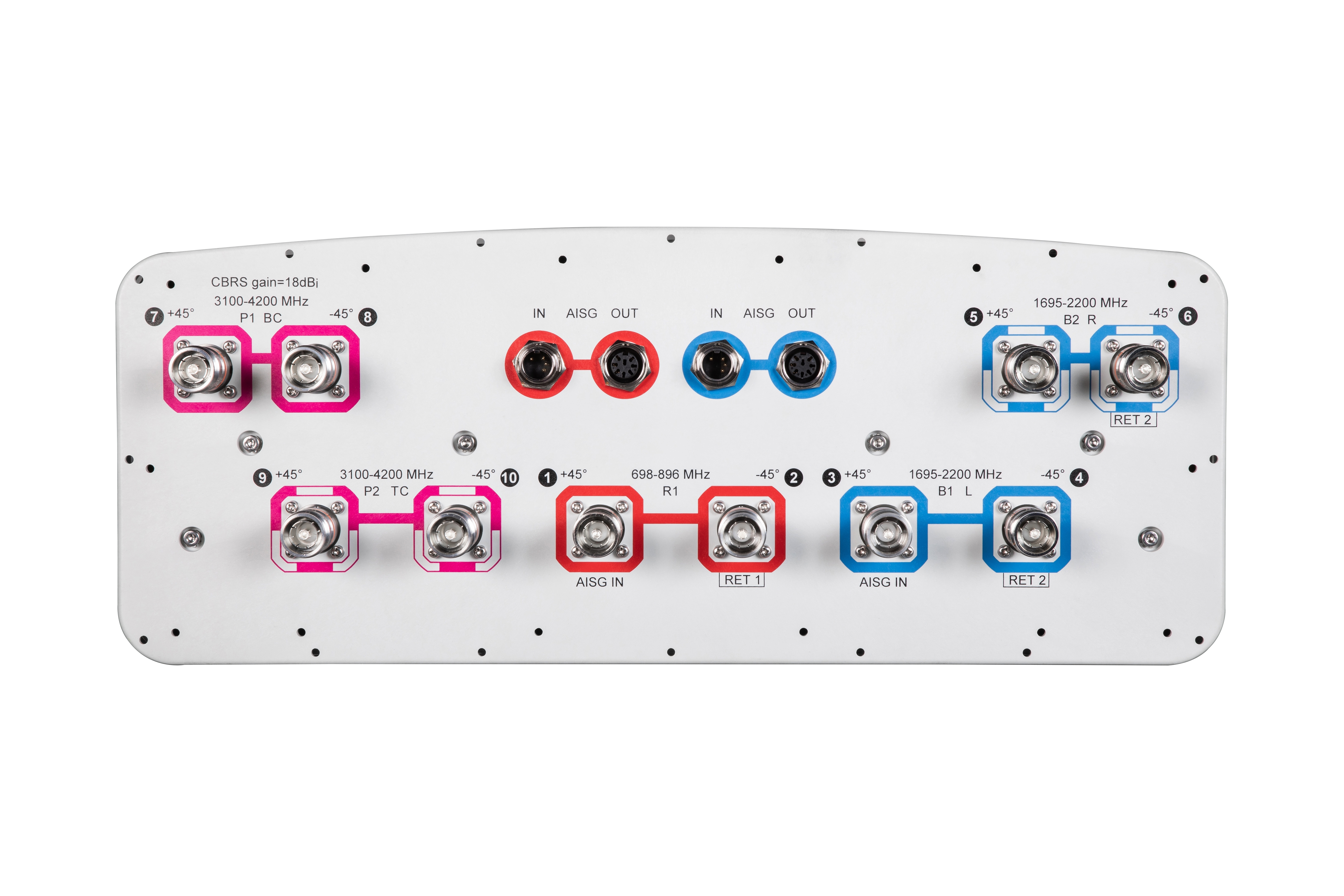 10-port sector antenna, 2x 698–896, 4x 1695–2200 and 4x 3100-4200 MHz, 45° HPBW, 2x RETs and 2x SBTs