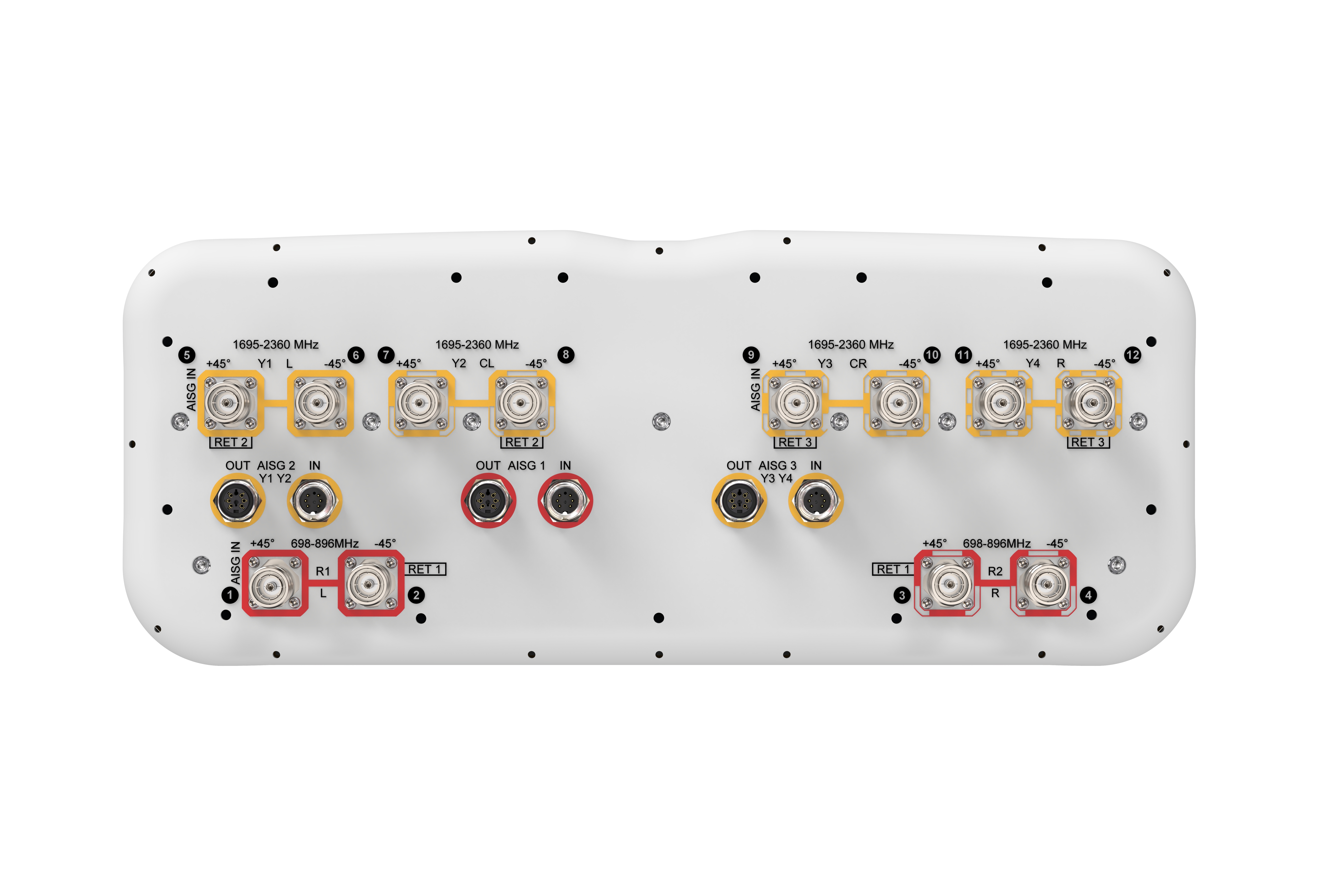 12-port sector antenna, 4x 698–896 and 8x 1695–2360 MHz, 65° HPBW, 3x RET, 3x SBT