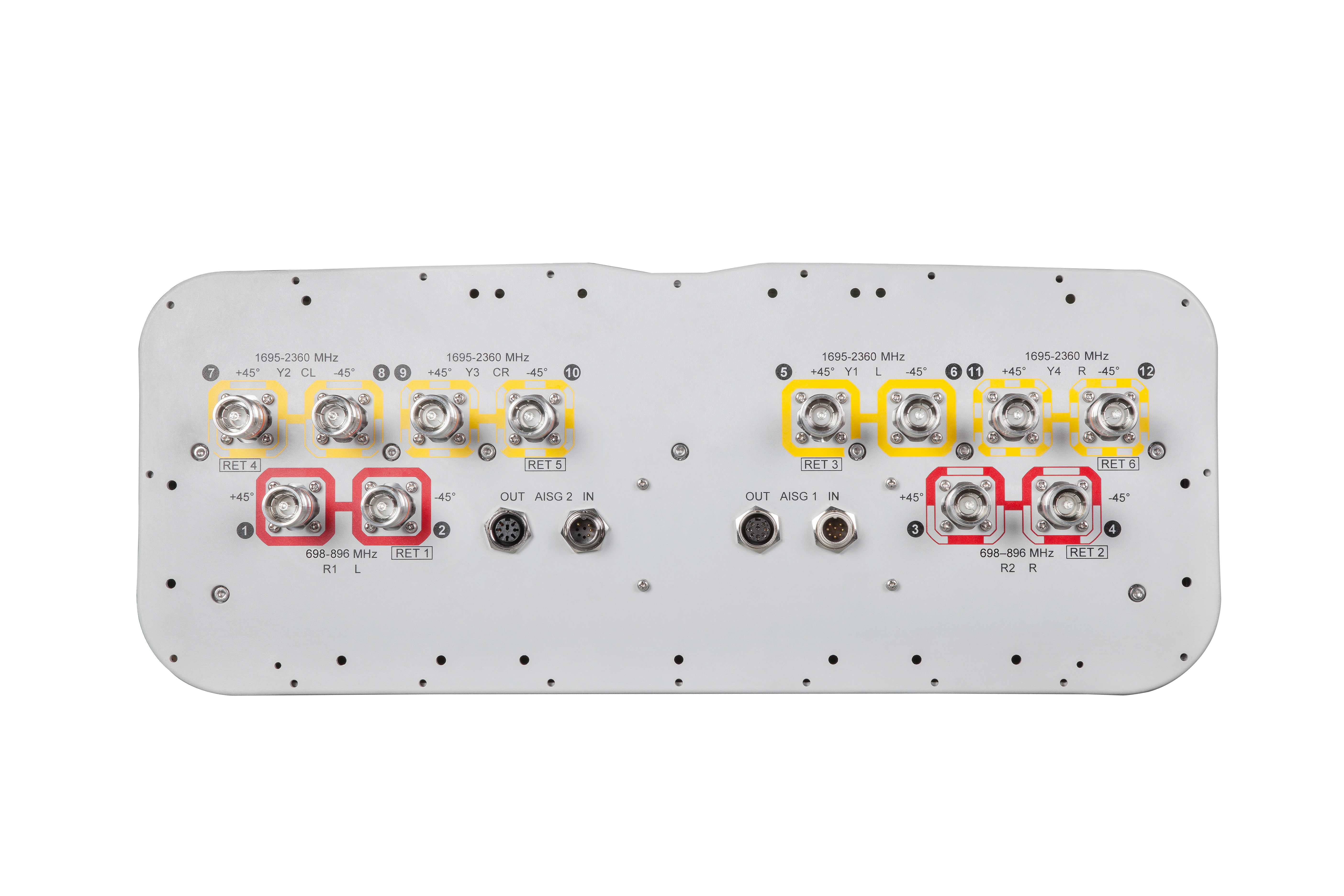 - Features broadband Low Band (698-896 MHz) and High Band (1695-2360 MHz) arrays for 4T4R (4X MIMO) capability for Band 14, AWS, PCS and WCS applications