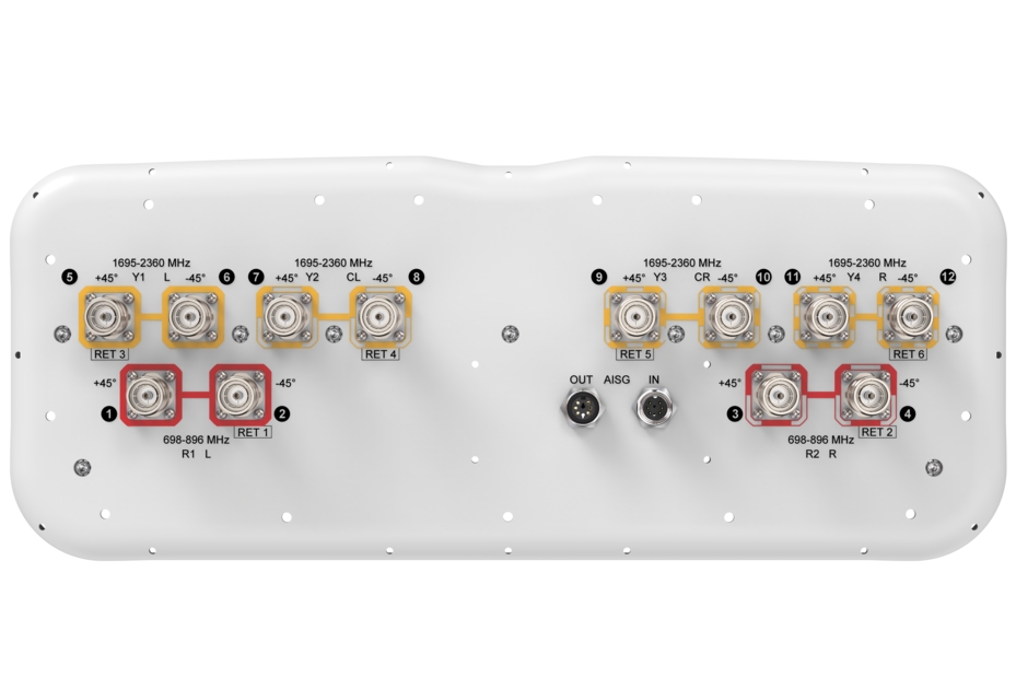 12-Port sector antenna, 4x 698-896 and 8x 1695-2360 MHz, 65° HPBW, 6x RET.