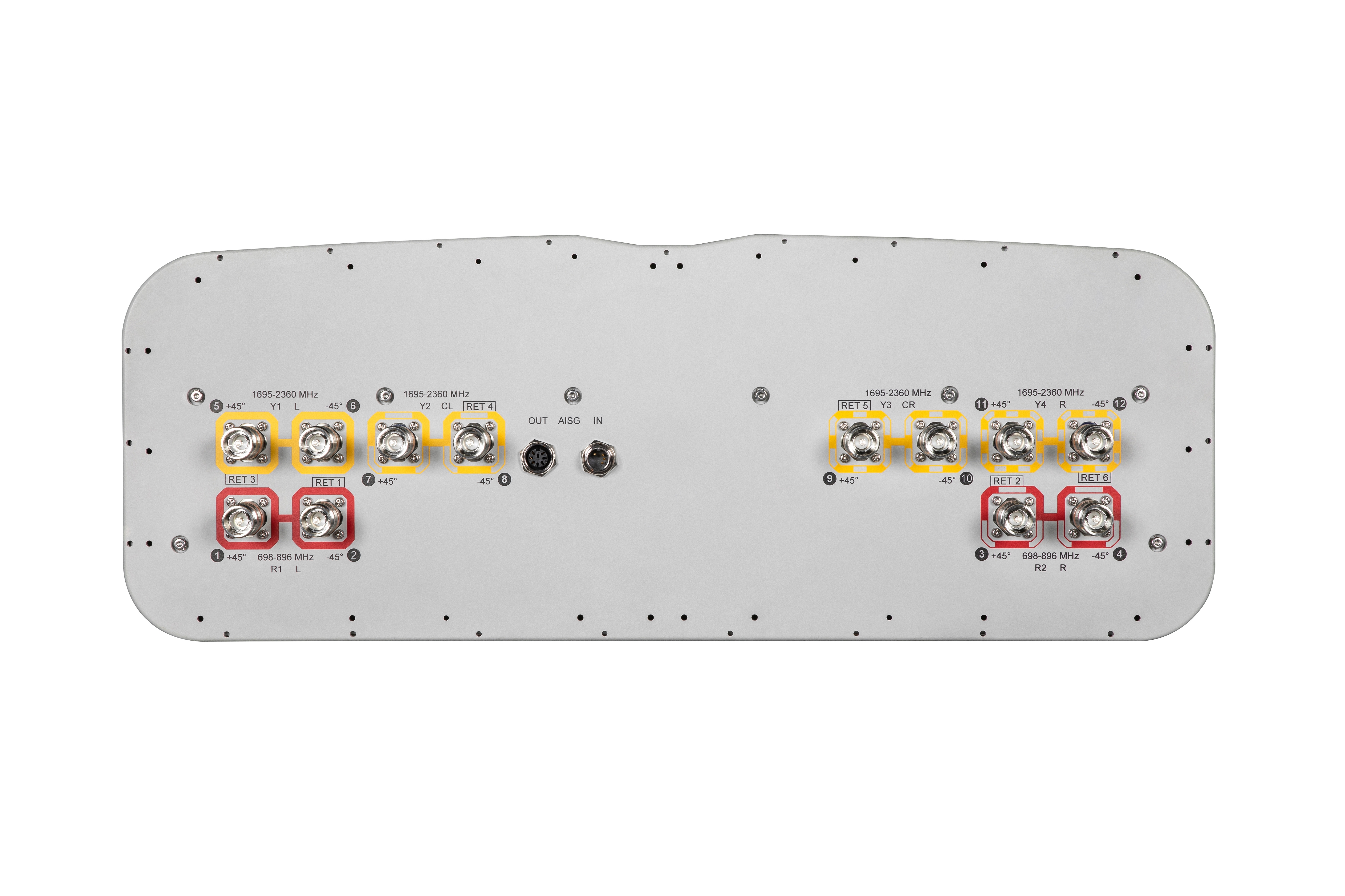 12-port sector antenna, 4x 698-896 and 8x 1695–2360 MHz, 65° HPBW, 6x RET.