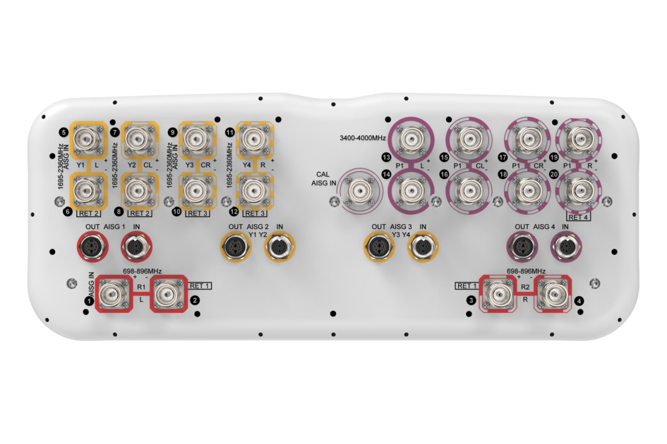 20-port sector antenna, 4x 698-896 and 8x 1695-2360 MHz, 65° HPBW, and 8 x 3400-4000 MHz, 90° HPBW, 4 x RET