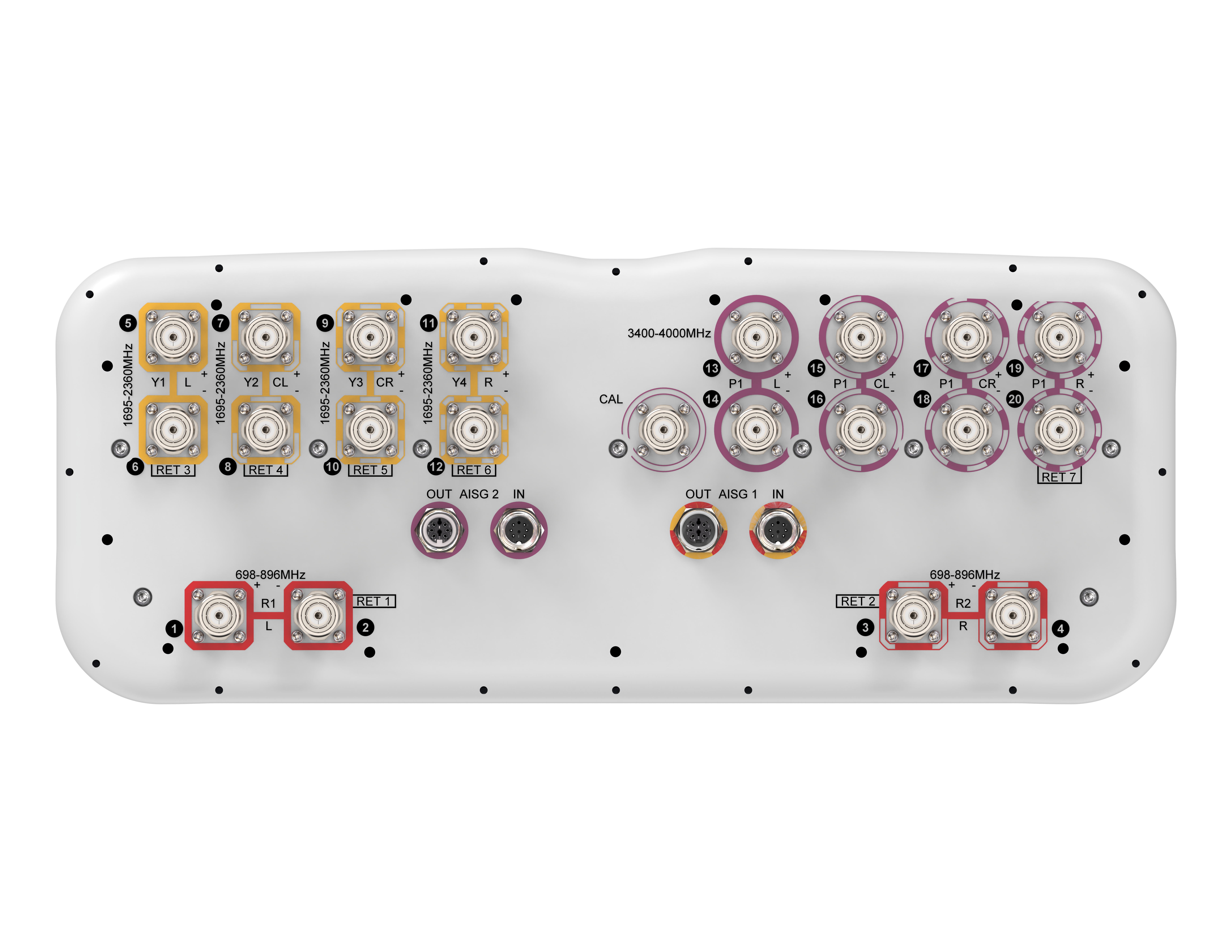 20-port sector antenna, 4x 698–896, 8x 1695–2360 MHz, 65° HPBW and 8x 3400-4000 MHz, 90° HPBW, 7x RET