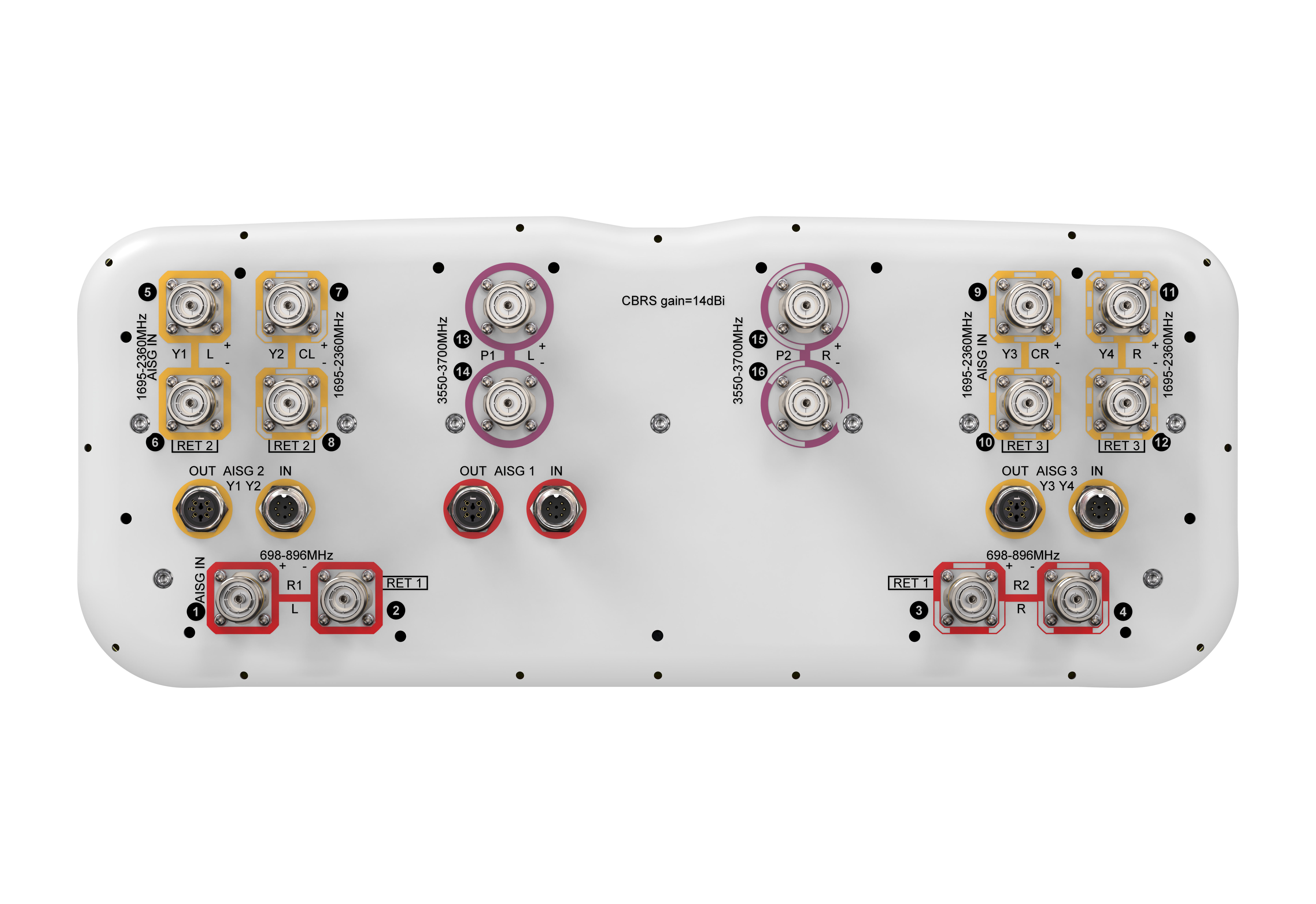 16- Port sector antenna, 4x 698-896, 8x 1695-2360 and 4x 3550-3700MHz, 65° HPBW, 3x RETs and 3x SBTs