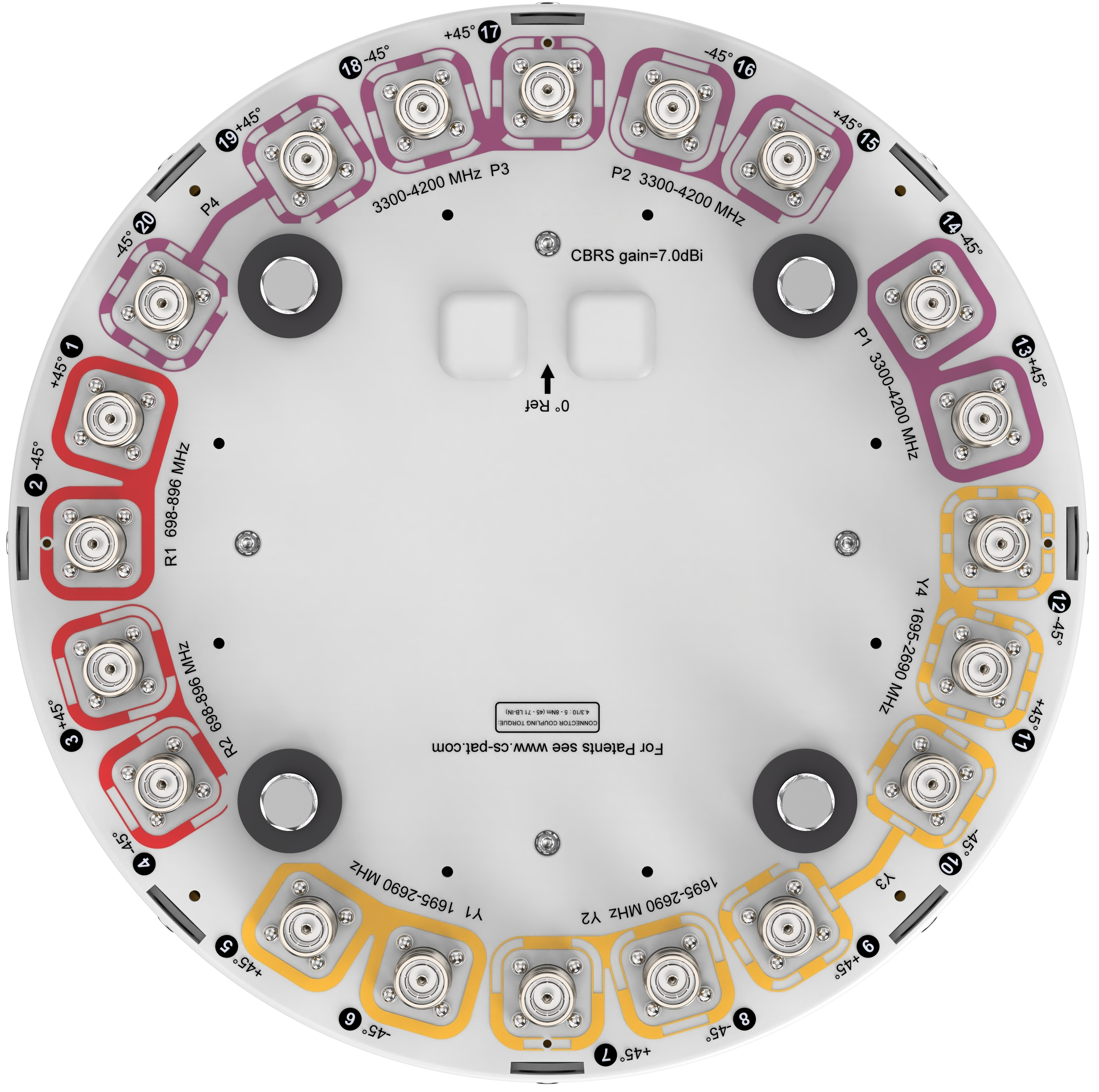 20-port small cell antenna, 4x 698-896, 8x 1695–2690, 8x 3300- 4200, 360° Horizontal Beamwidth, fixed tilt.