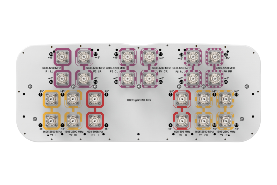 24-port, 4x 698-896MHz, 8x 1695-2690MHz, 12x 3300-4200MHz, 65°, 2 ft, 4deg fixed tilt for 698-896MHz and 1695-2690MHz, 0deg fixed tilt for 3300-4200MHz