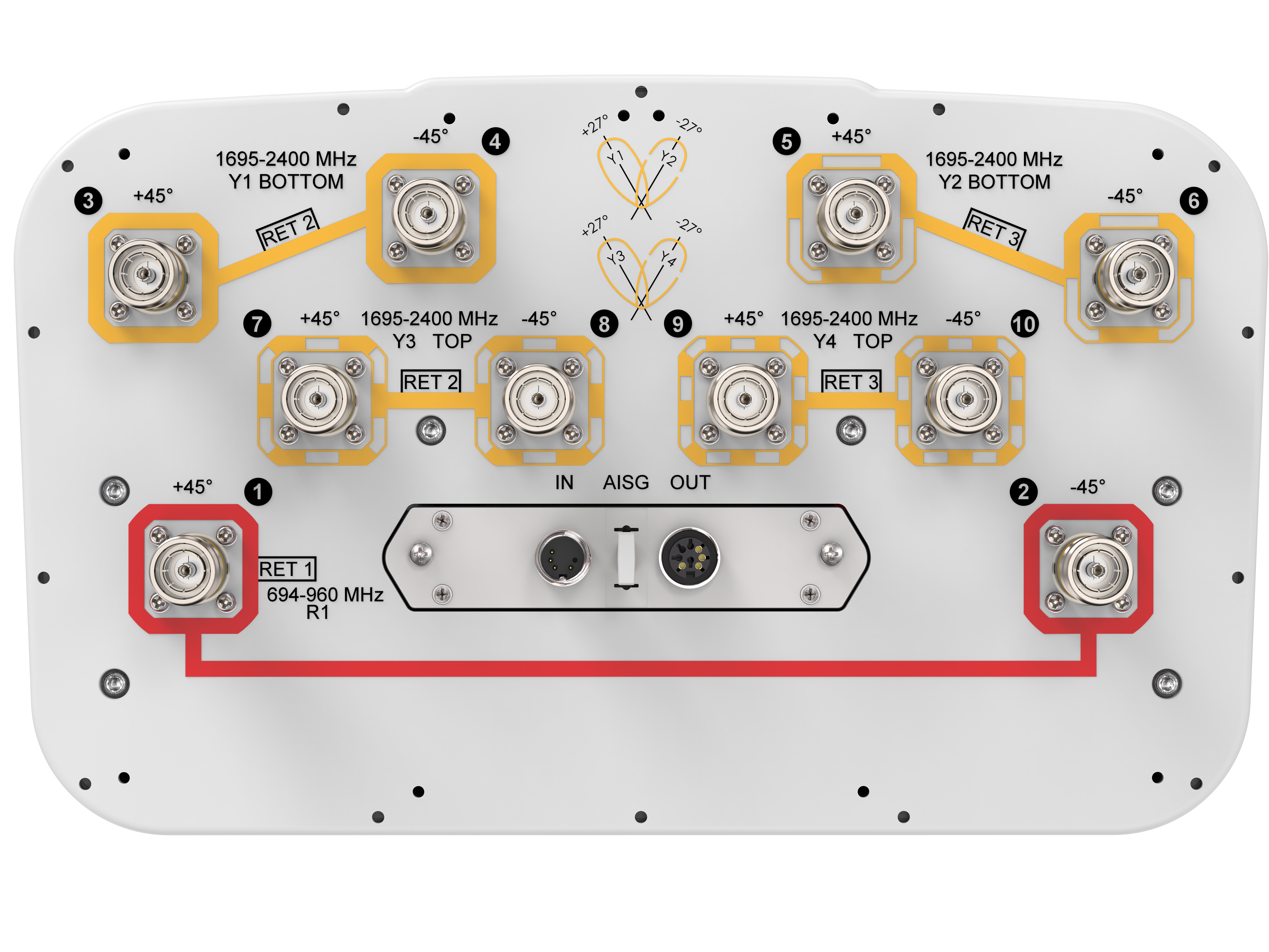 10-port sector/multibeam antenna, 2x 694–960 sector and 8x 1695–2400 multibeam, 65° sector and 33° 4x multibeam, 3x RET