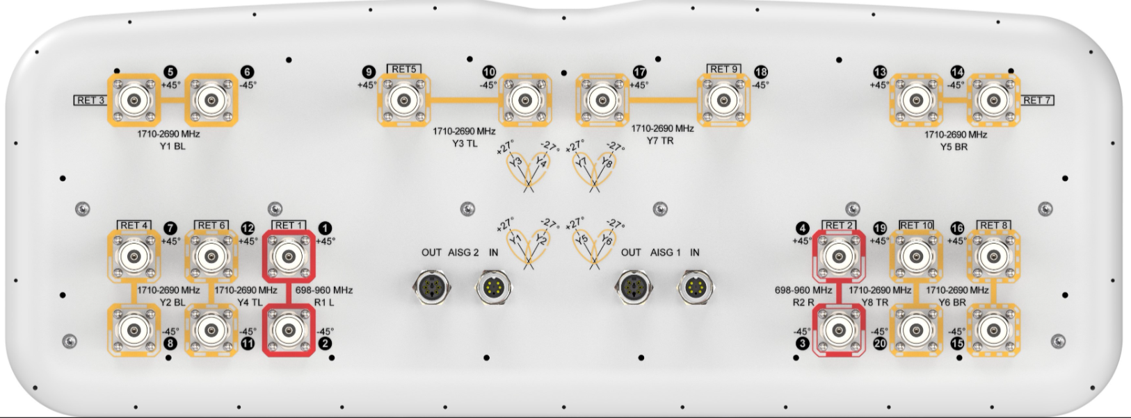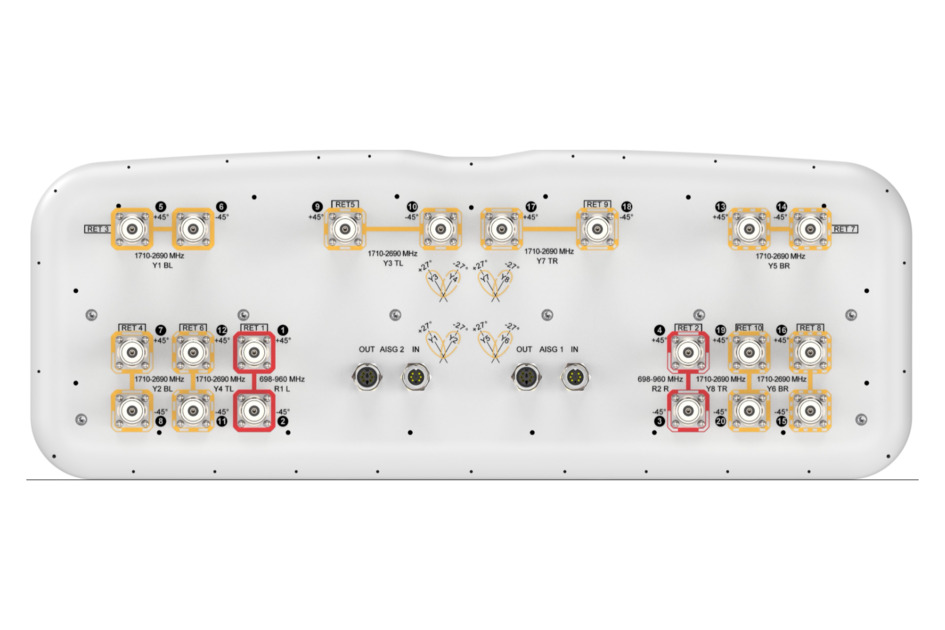 20-port Sector/Multi beam antenna, 4x 698–960 MHz 65° HPBW and 16x 1710-2690MHz 8x33° HPBW, 10x RET