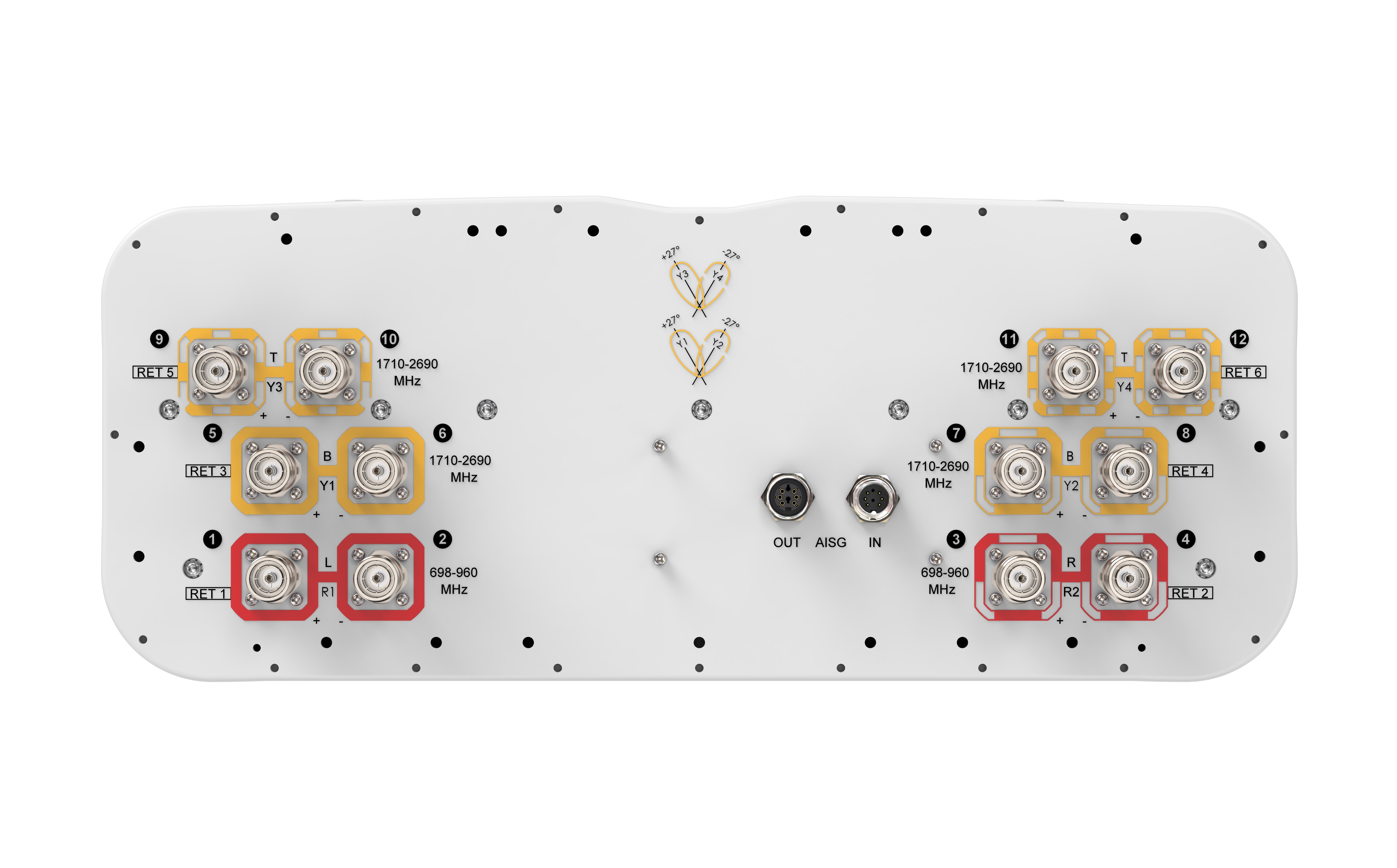 12-port sector/multibeam antenna, 4x 698–960 MHz 65° HPBW and 8x 1710–2690 MHz 4x 33° HPBW, 6x RET