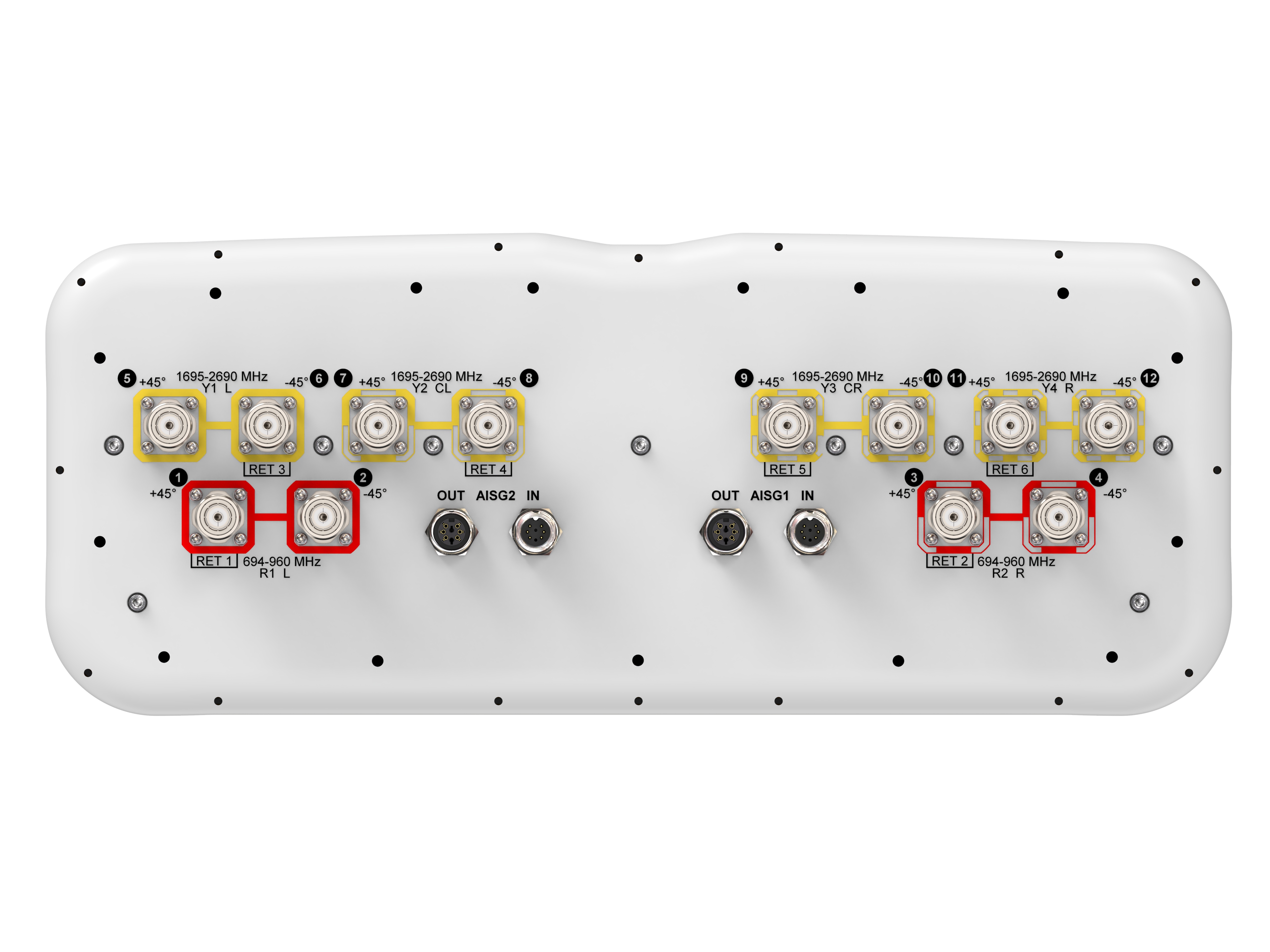 12-port sector antenna, 4x 694–960MHz, 65° HPBW and 8x 1695–2690 MHz, 85° HPBW, 6x RET