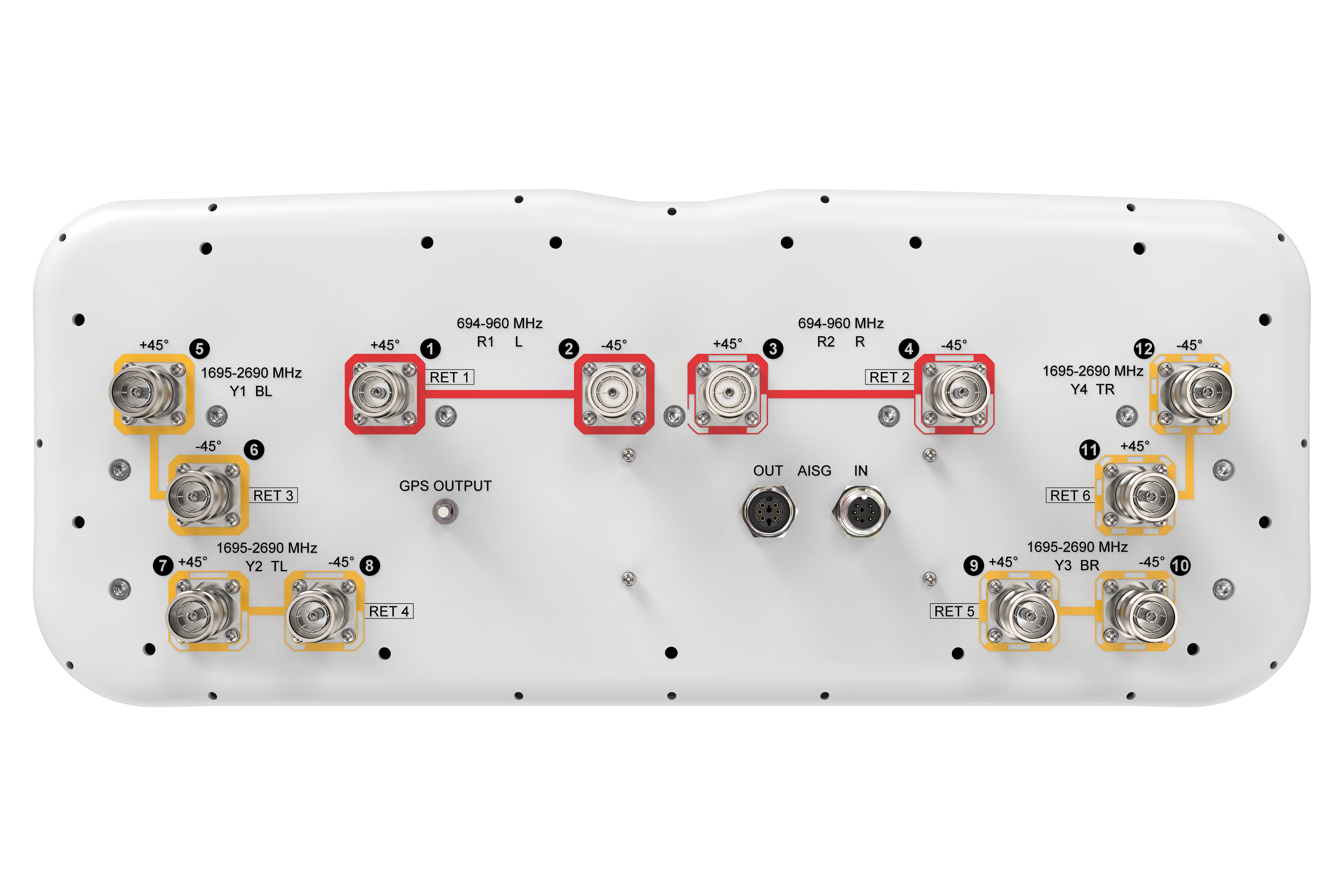 12-port sector antenna, 4x 698–960 and 8x 1695–2690 MHz, 65° HPBW, 6x IntRET. Bands cascaded SRET.