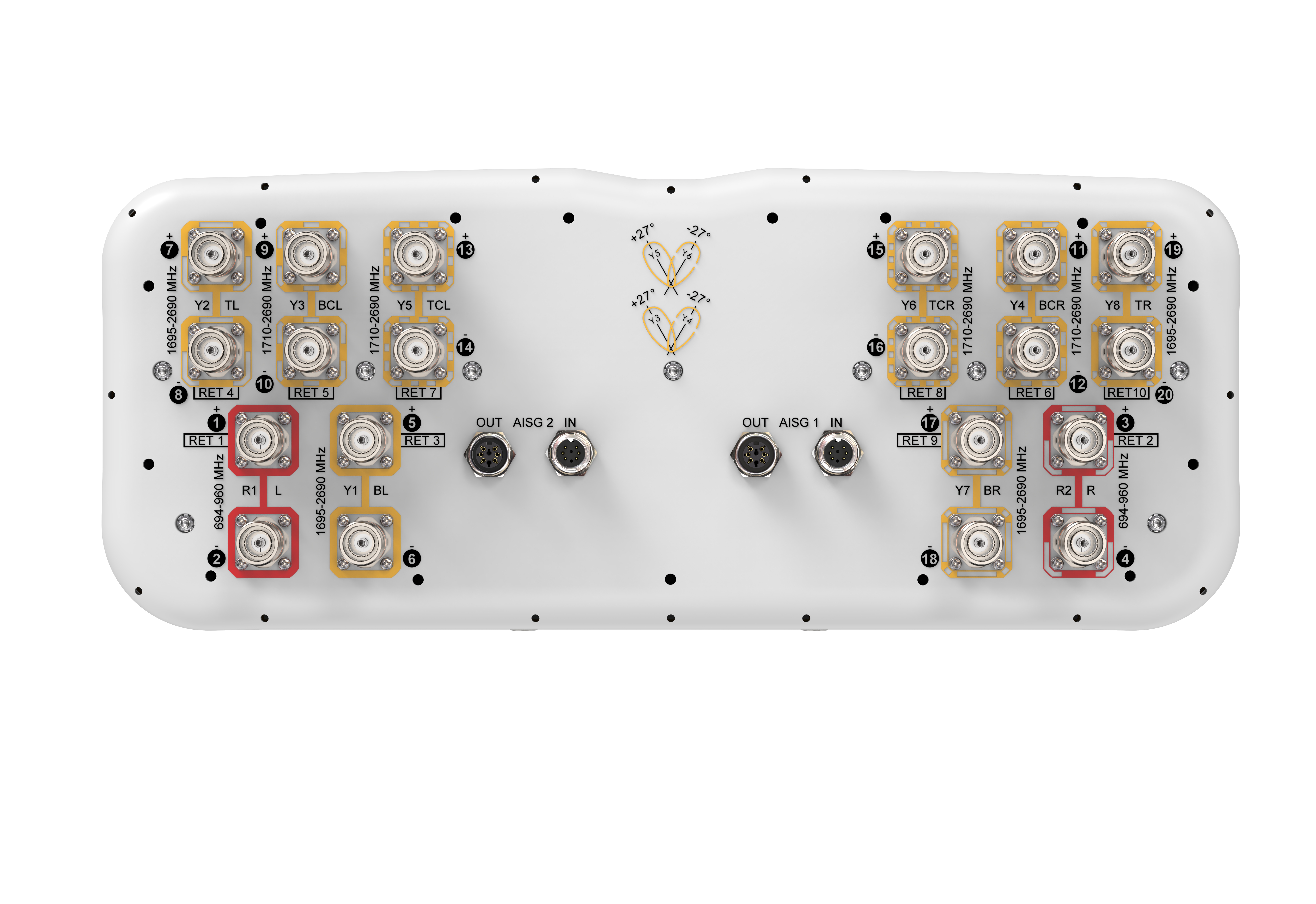 20-port sector/multibeam antenna 4x 694–960 MHz , 8x 1695-2690 MHz 65° HPBW and 8x 1710–2690 MHz 2x 2-Beam 33°HPBW, 10x RET. Band cascaded SRET