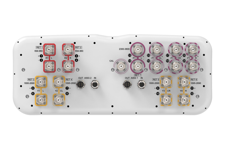 20-port sector antenna,4 x 694-960 MHz (R1-R2), and 8 x 1695-2690 MHz (Y1-Y4) 65° HPBW, 8 x 2300-3800 MHz (P1), 90° HPBW, 7 x RET