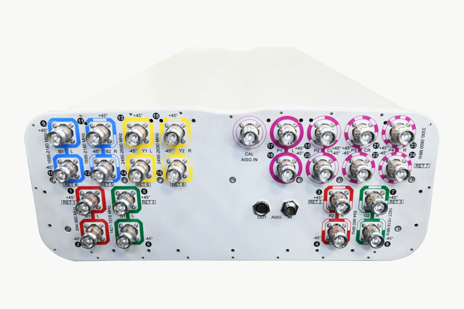 24-port sector antenna, 4x 694–960, 4x 1427–1518, 4x 1695-2180, 4x 2490-2690 65° HPBW and 8x 3300-3800 MHz, 7x RET