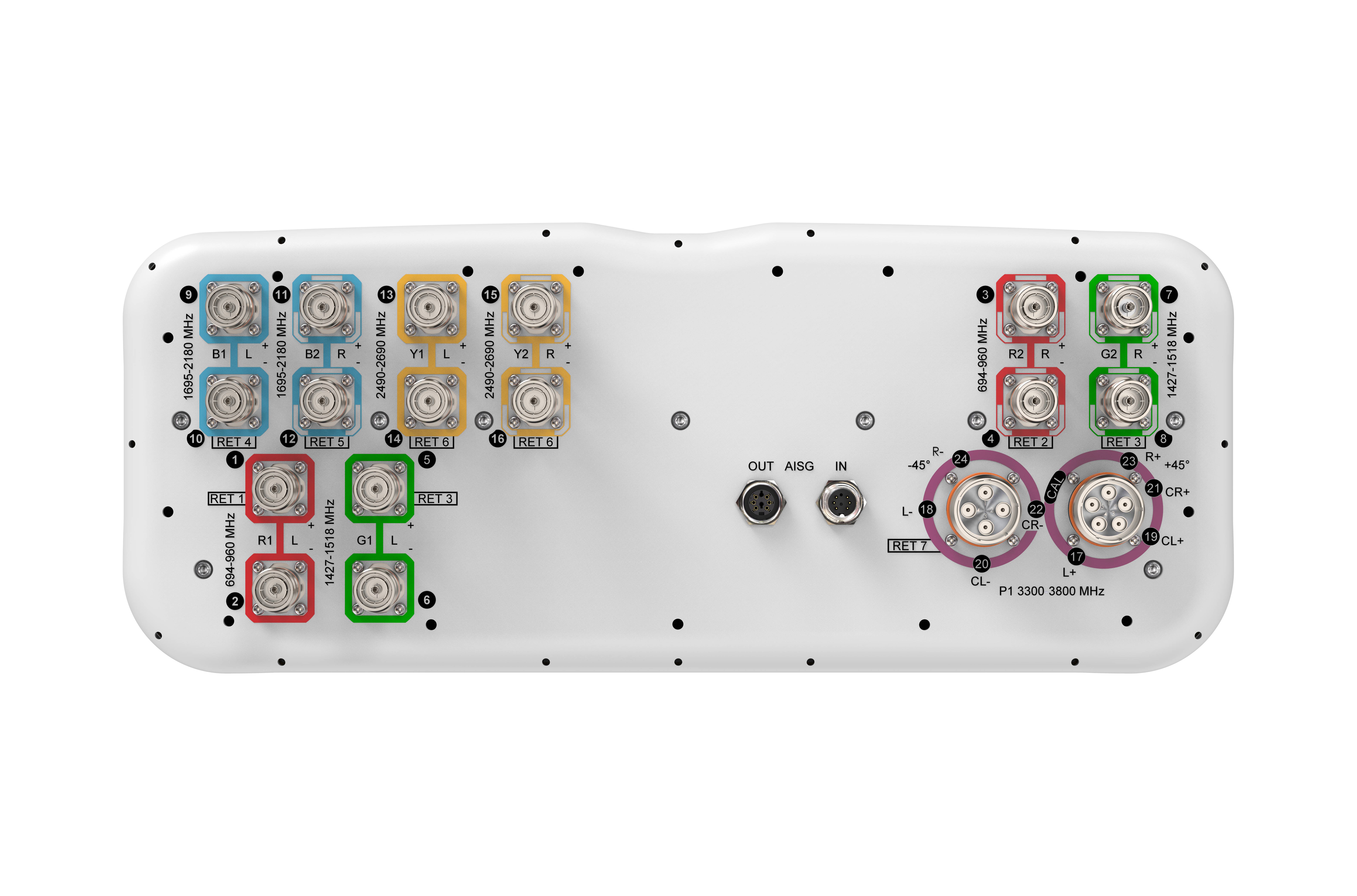 24-port sector antenna, 4x 694–960, 4x 1427–1518, 4x 1695-2180, 4x 2490-2690 65° HPBW and 8x 3300-3800 MHz, 7x RET