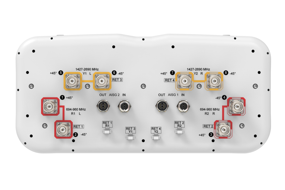 - Antenna includes 2x Single Column X-Pol Arrays for 694-960MHz and 2x Single Column X-Pol Arrays for 1427-2690MHz, suitable for 4x MIMO applications