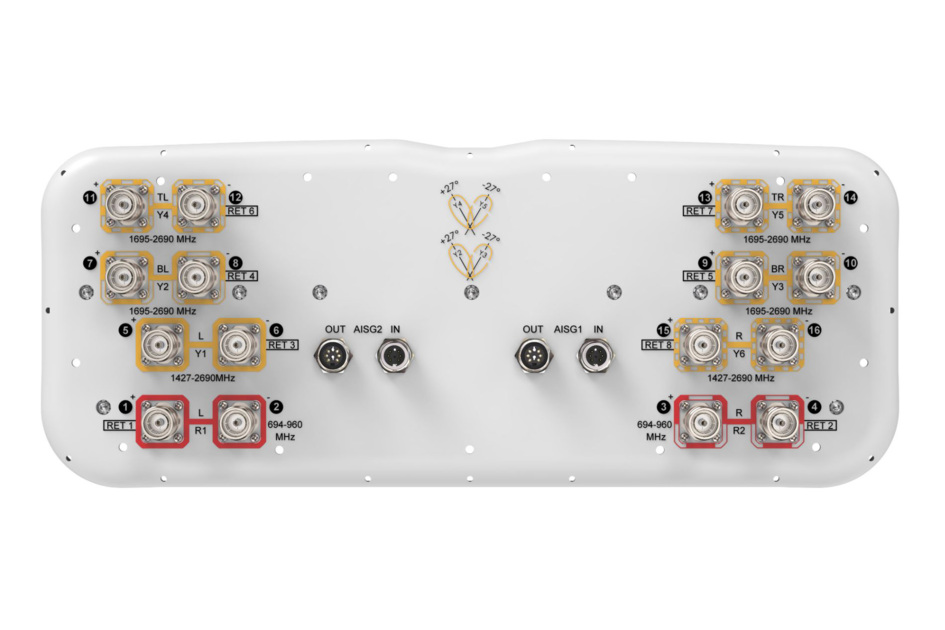 16-port sector/multibeam antenna 4x 694–960 MHz, 4x 1427-2690 MHz 65° HPBW and 8x 1695–2690 MHz 2x 2-Beam 33°HPBW, 8x RET