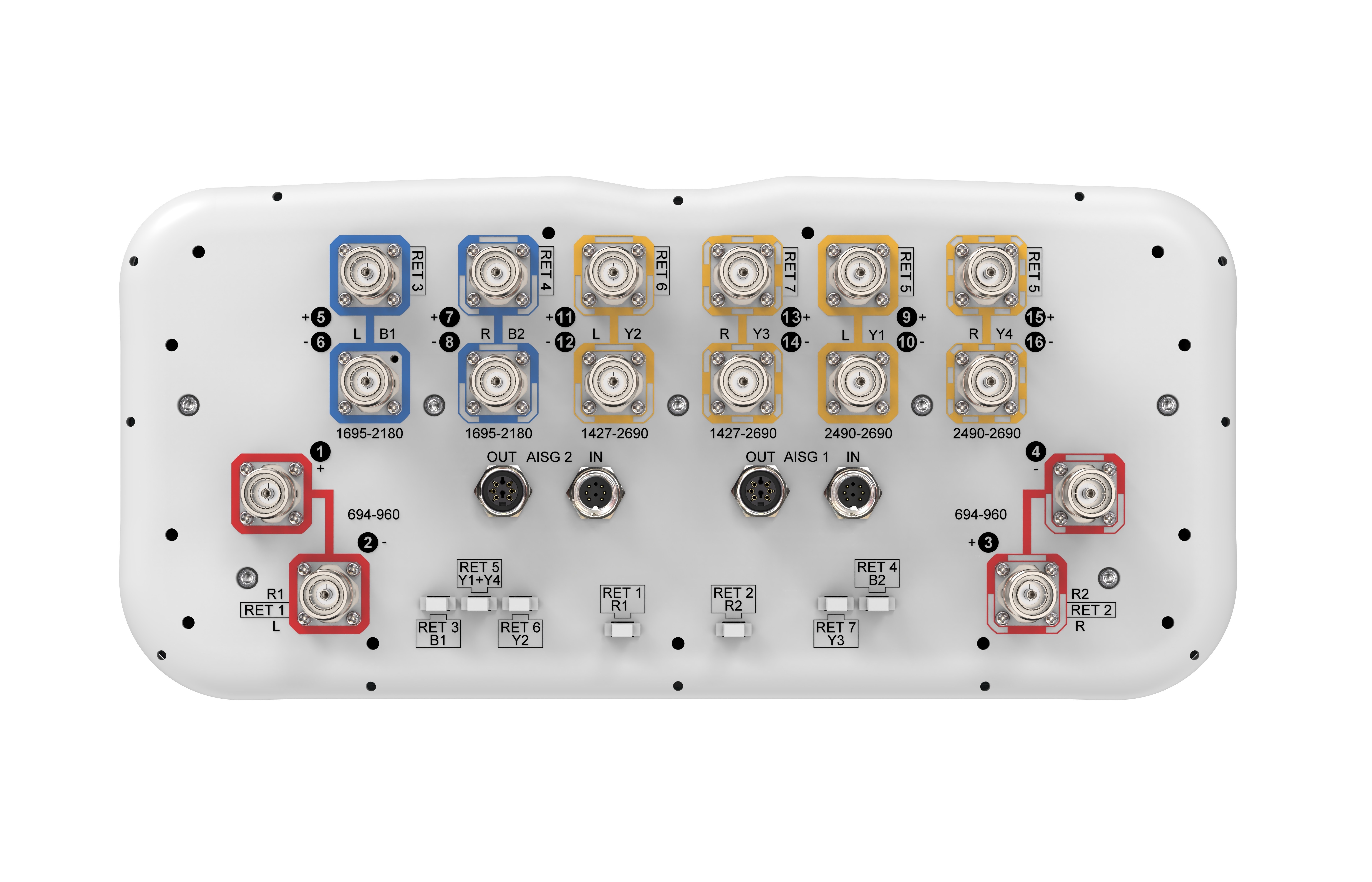 16-port sector antenna, 4x 694–960, 4x 1427–2690, 4x 1695-2180 and 4x 2490-2690 MHz, 65° HPBW, 7x RET