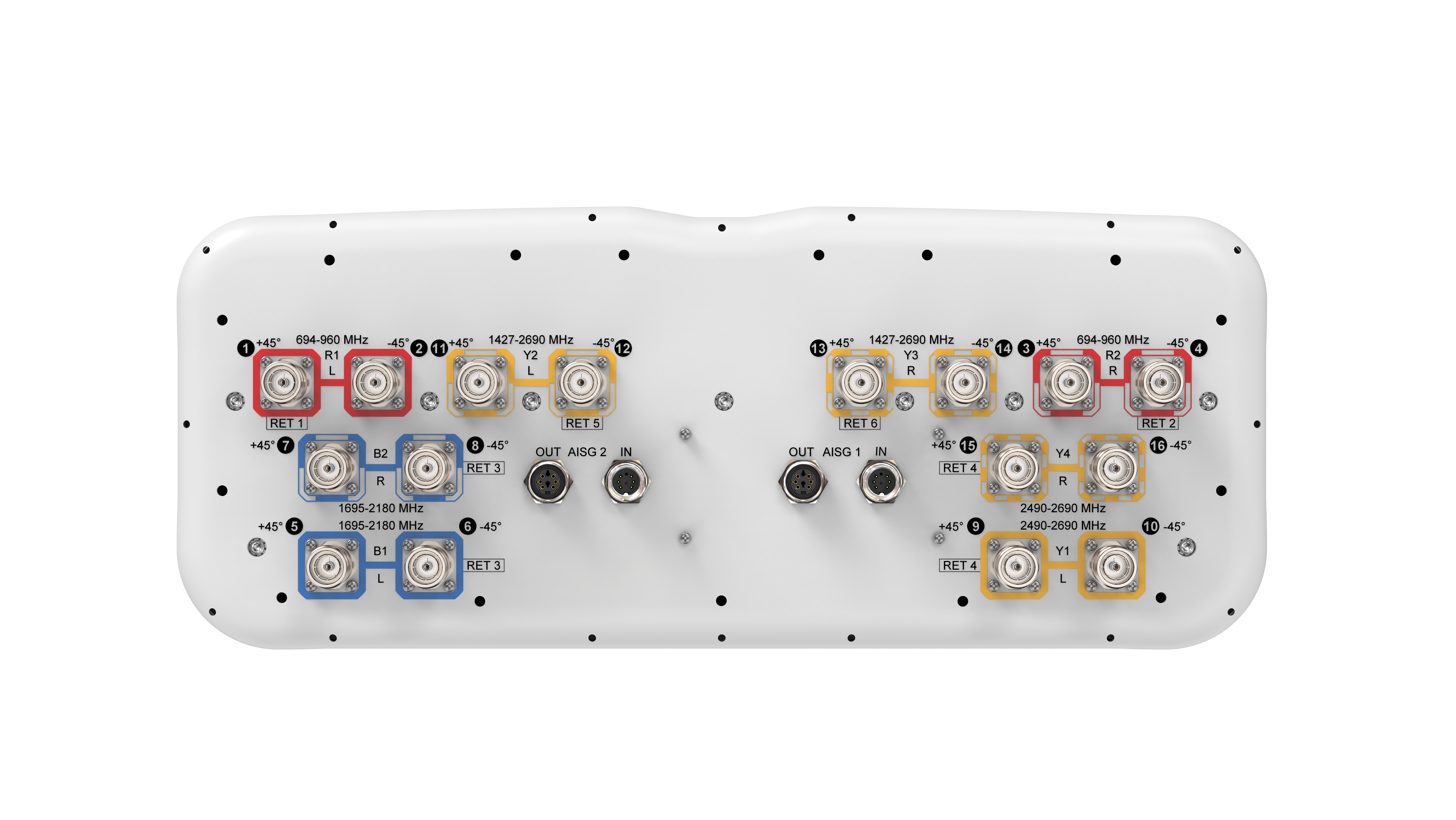 16-port sector antenna, 4x 694–960, 4x 1427–2690, 4x 1695-2180 and 4x 2490-2690 MHz, 65° HPBW, 6x RET