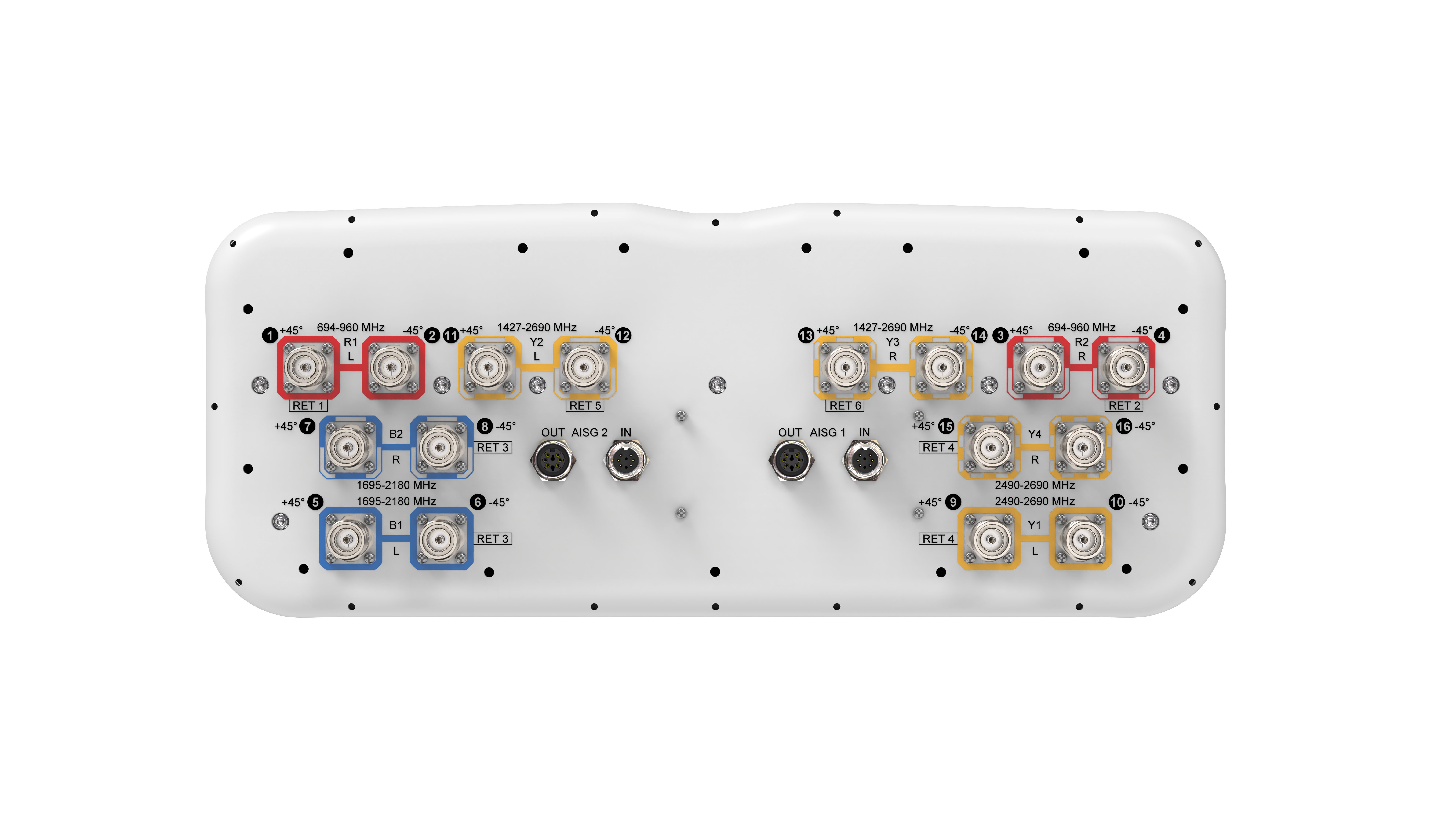 16-port sector antenna, 4x 694–960, 4x 1427–2690, 4x 1695-2180 and 4x 2490-2690 MHz, 65° HPBW, 6x RET
