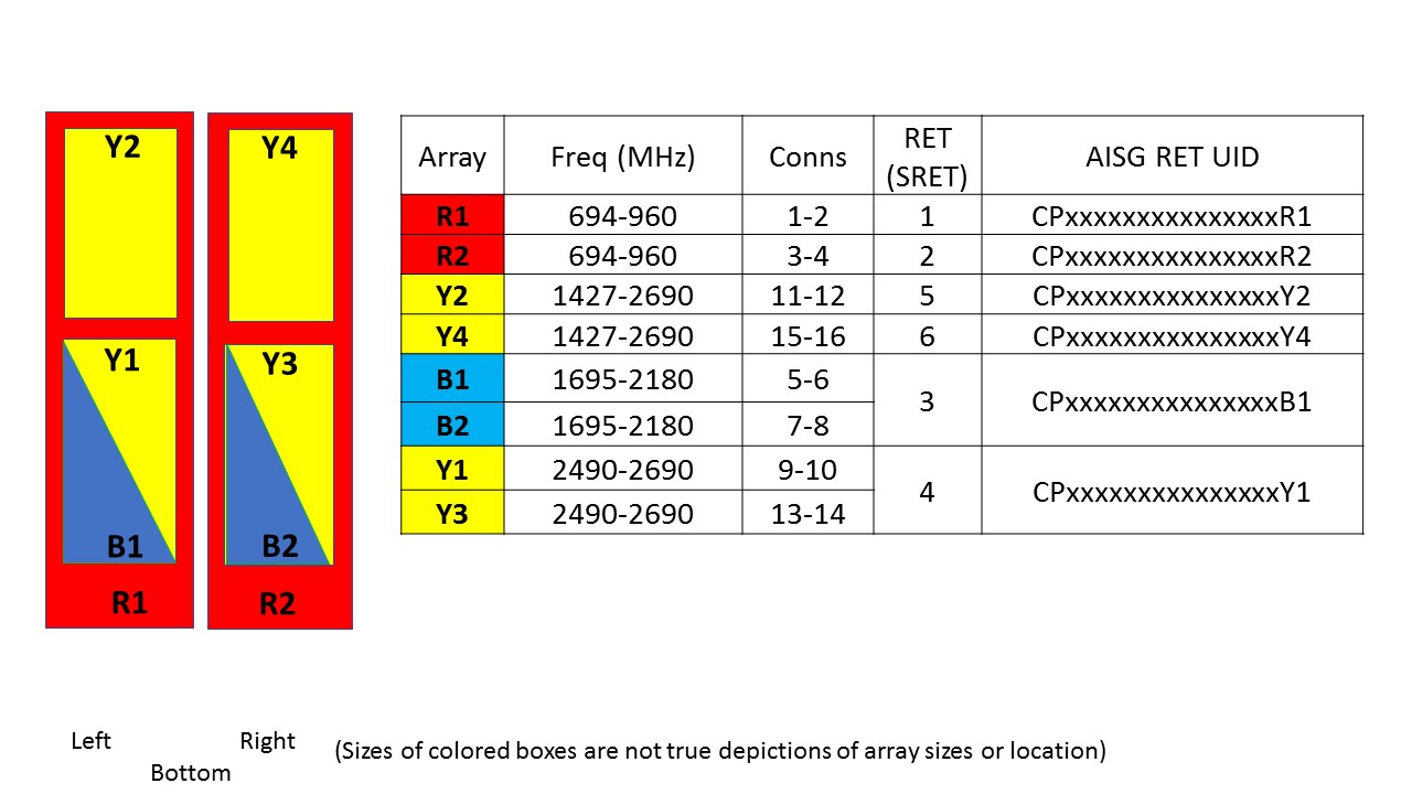 - Electrical tilt settings applicable to RF Ports R1, R2, Y2, Y4 can be set independently (See Array Layout and RET Table below)