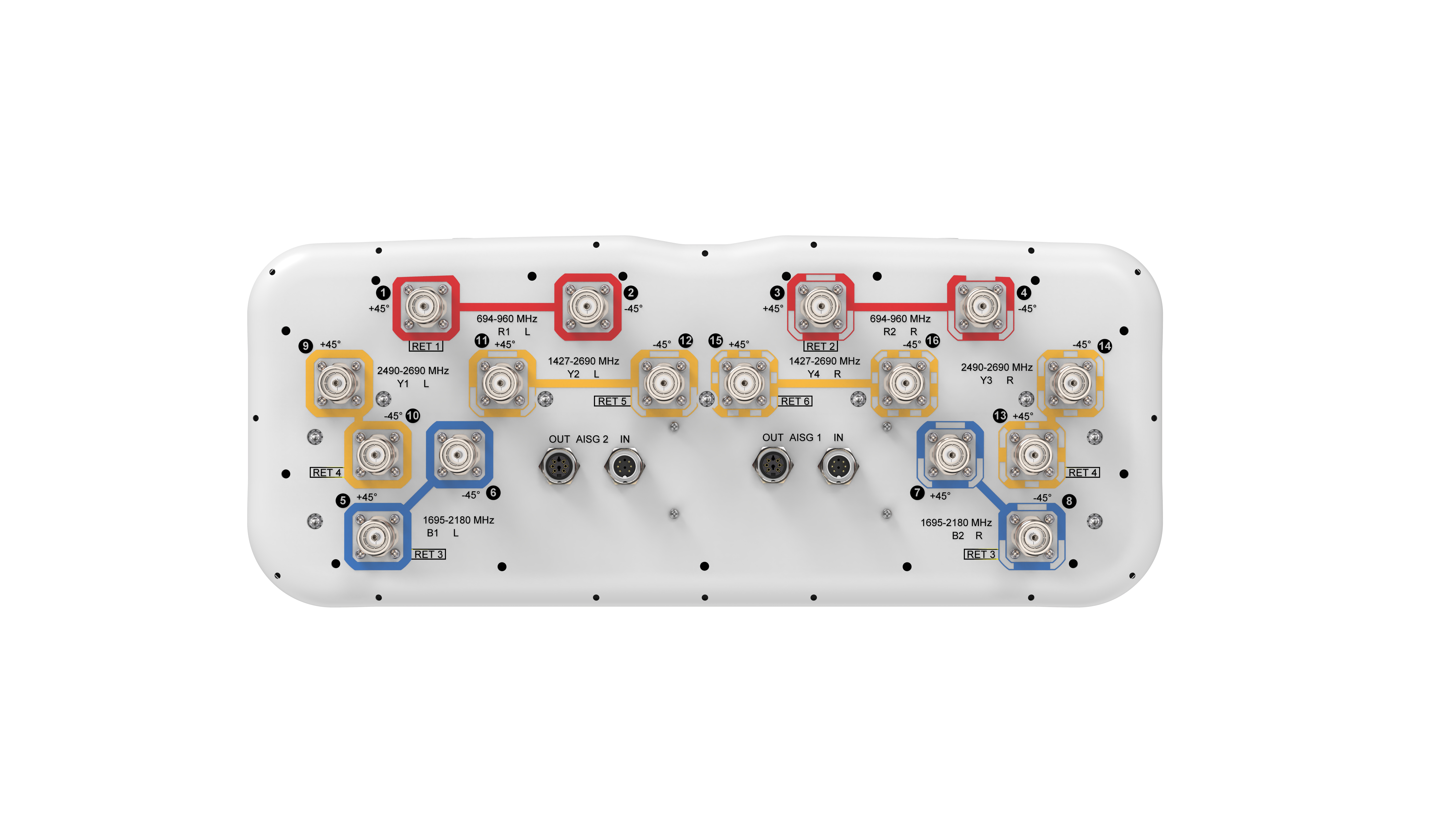 16-port, sector antenna, RF port assignments are as follows: R1+R2 = 694–960, Y2+Y4 = 1427-2690MHz, B1+B2 = 1695–2180 and Y1+Y3 = 2490-2690 MHz, 65° horizontal beamwidth, 6x Internal RET. B1+B2 and Y1+Y3 share common RET, 2.7m