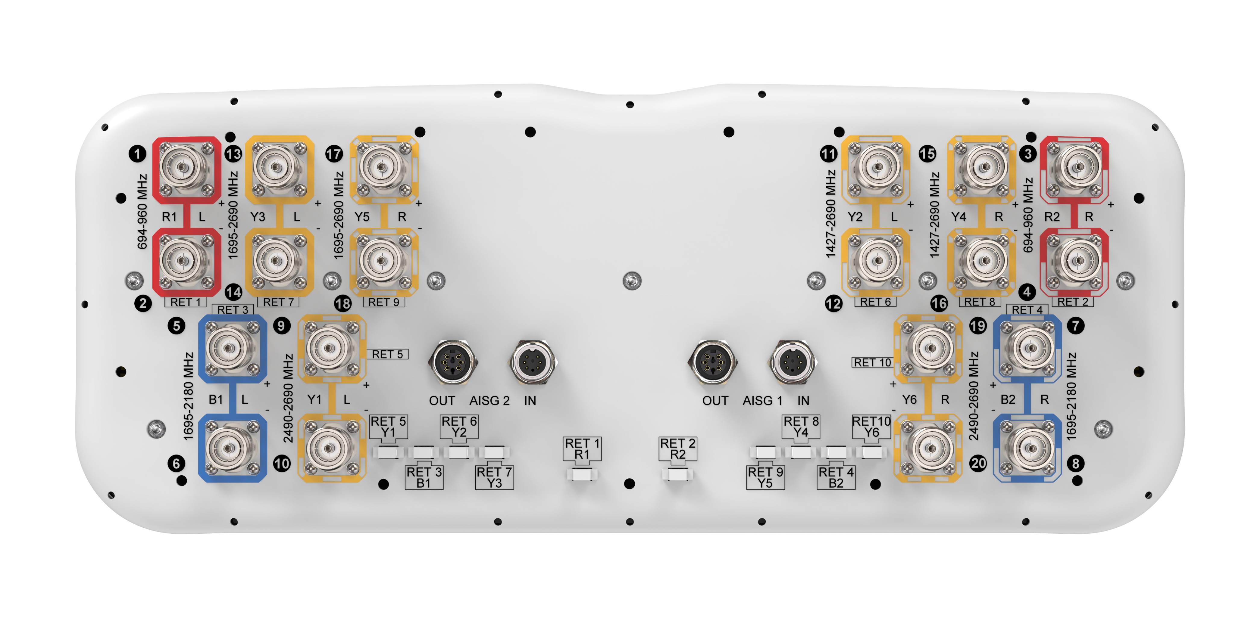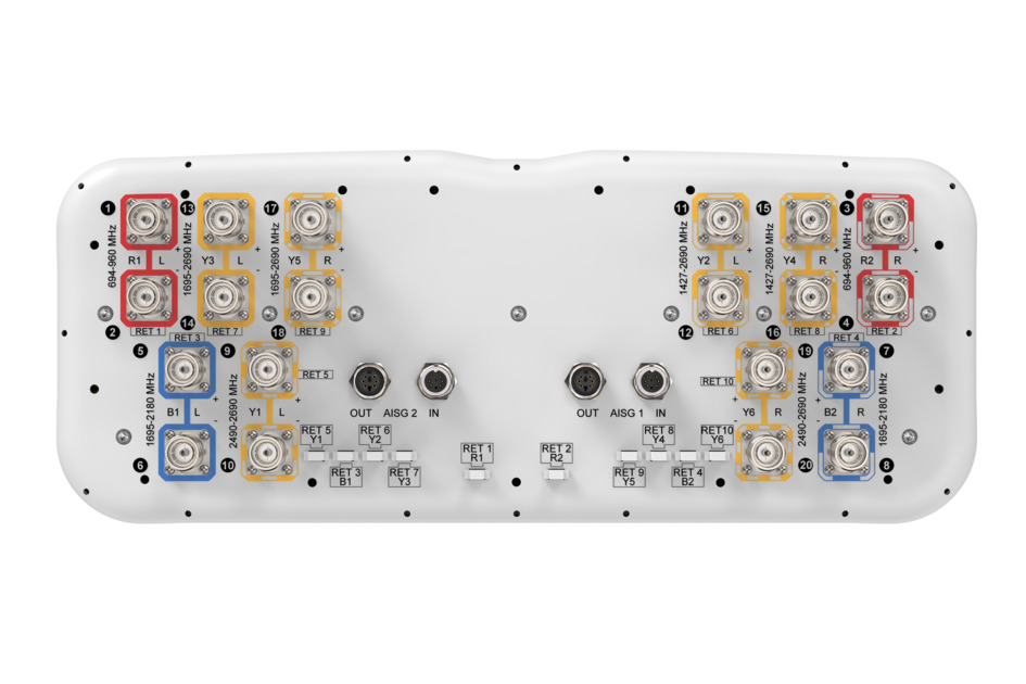 20-port sector antenna, 4x 694–960 , 4x 1427–2690, 4x 1695-2180, 4x 2490-2690 and 4x 1695-2690MHz, 65° HPBW, 10x RET