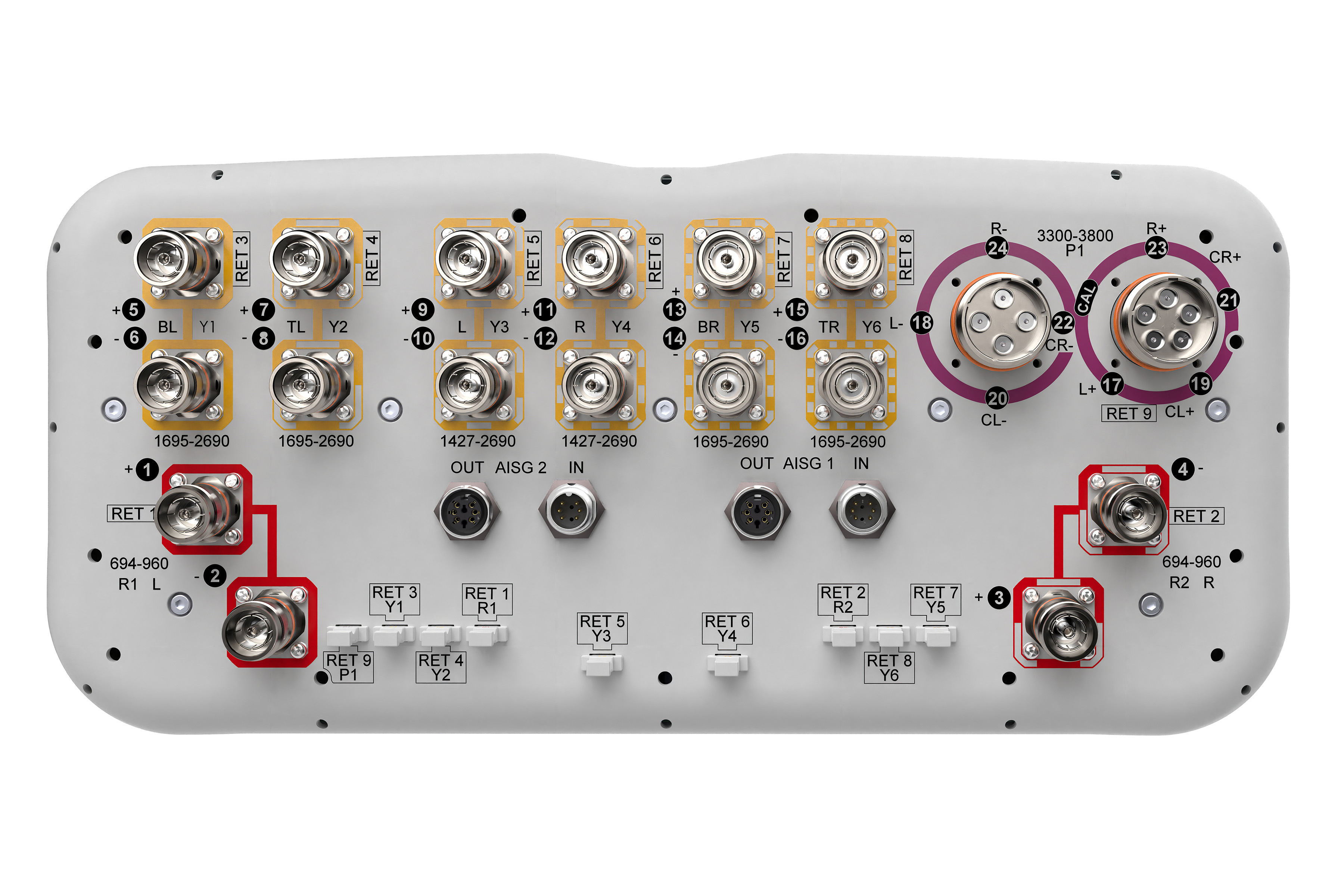 24-port sector antenna, 4x 694-960, 4x 1427-2690, 8x 1695-2690 MHz, 65° HPBW and 8x 3300-3800 MHz, 90° HPBW, 9x RET.