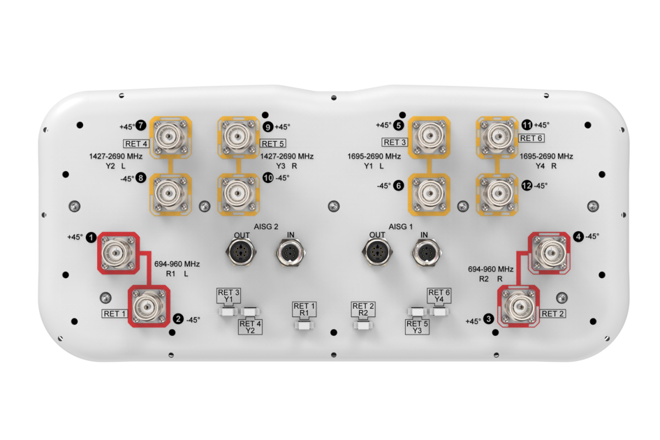 12-port sector antenna, 4x 694-960,4x 1427–2690 and 4x 1695- 2690 MHz, 65° HPBW, 6x RET