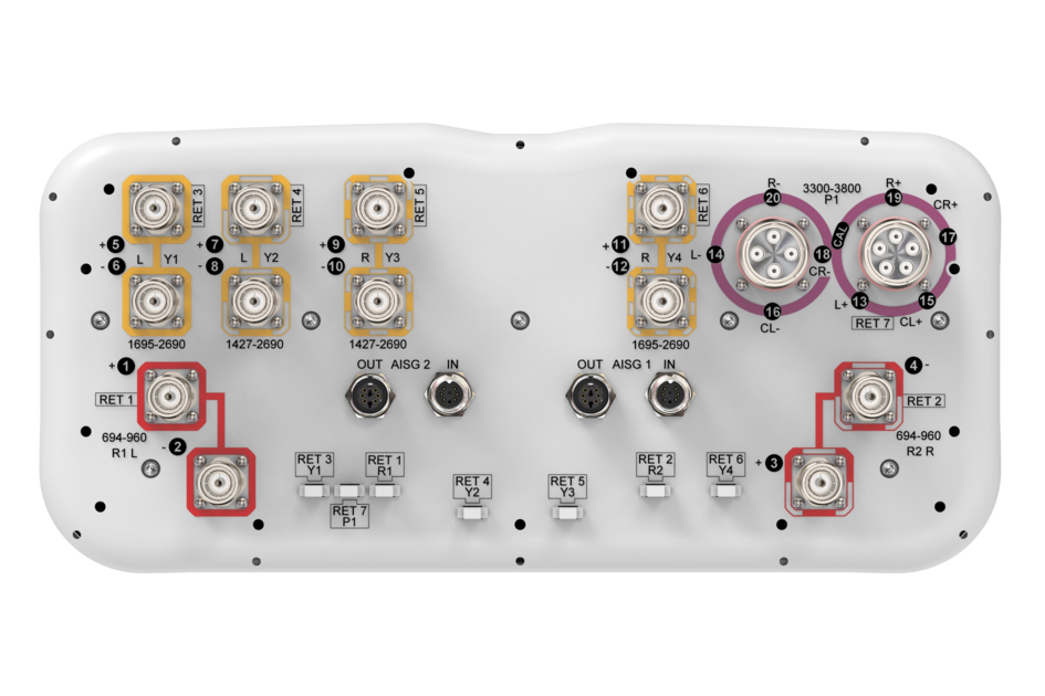 20-port sector antenna, 4x 694-960, 4x 1427-2690, 4x 1695-2690 MHz, 65° HPBW and 8x 3300-3800 MHz, 90° HPBW, 7x RET.