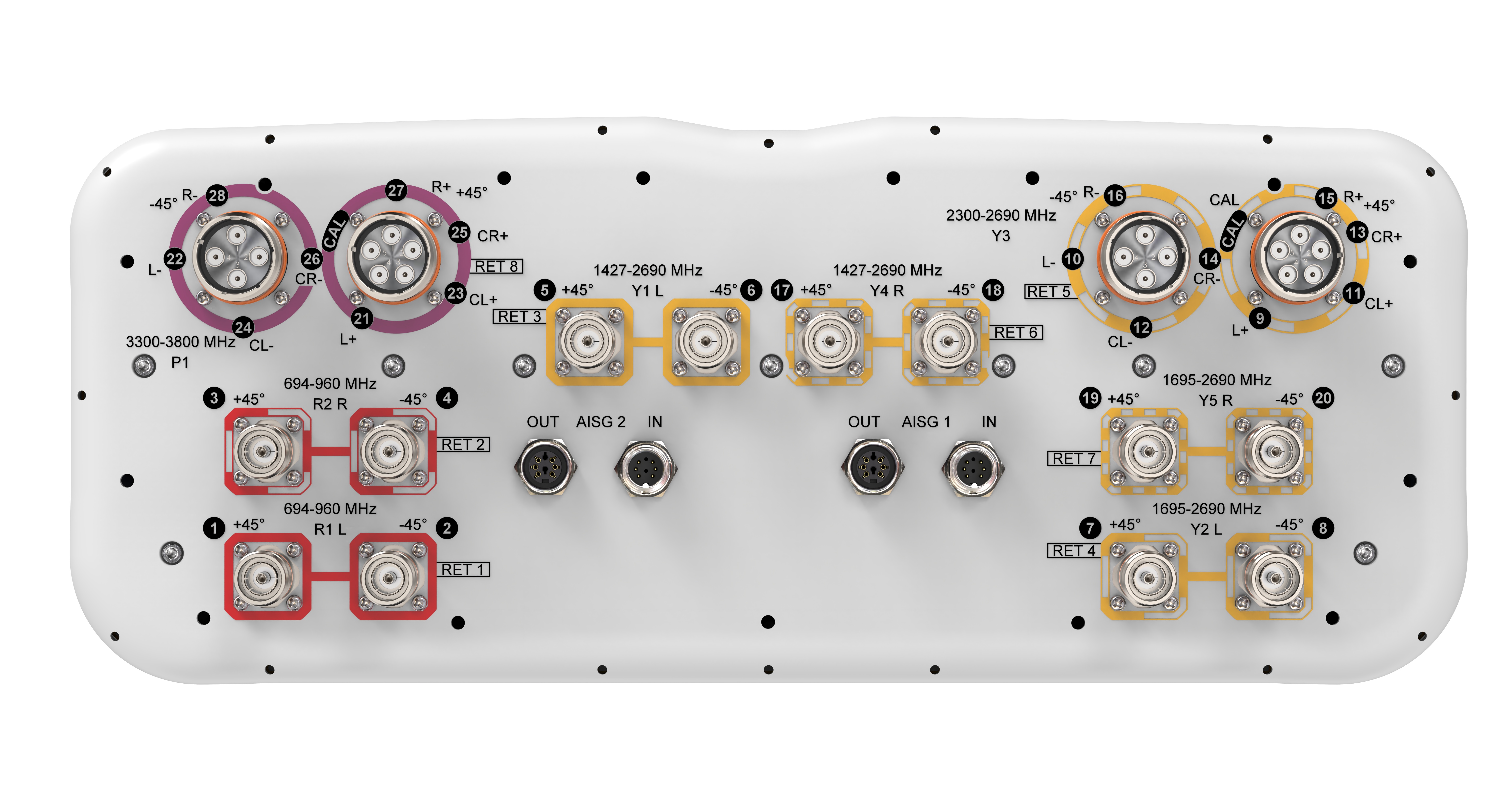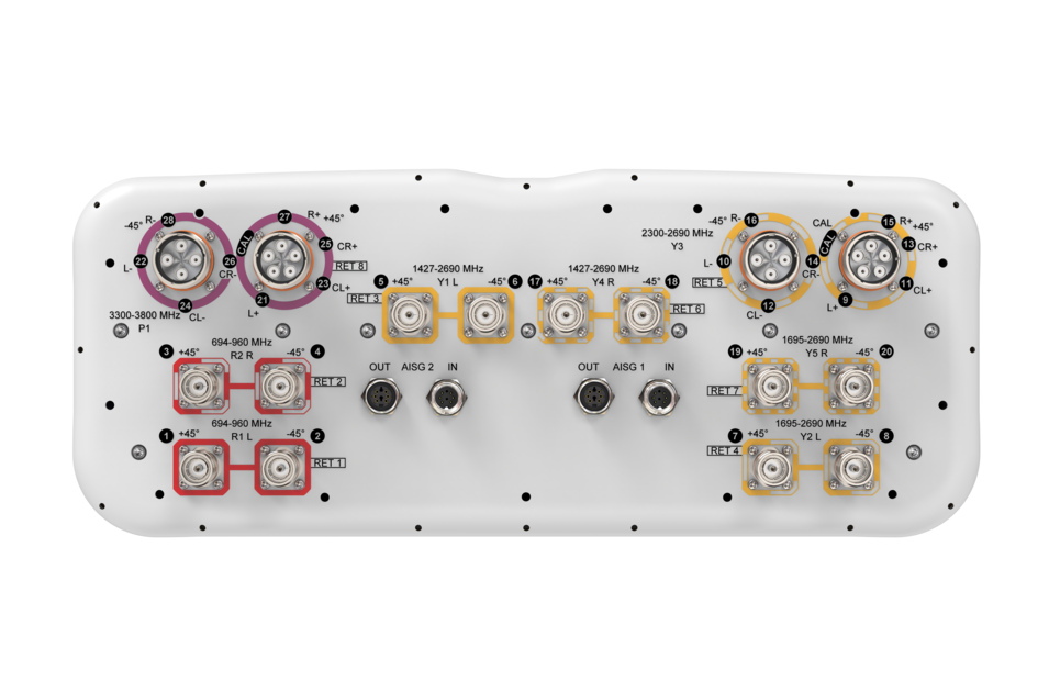 28-port sector antenna, 4x 694–960, 4x 1427-2690 and 4x 1695- 2690 MHz 65° HPBW, 8x 2300–2690 and 8x 3300-3800MHz, 90° HPBW, 8x RET
