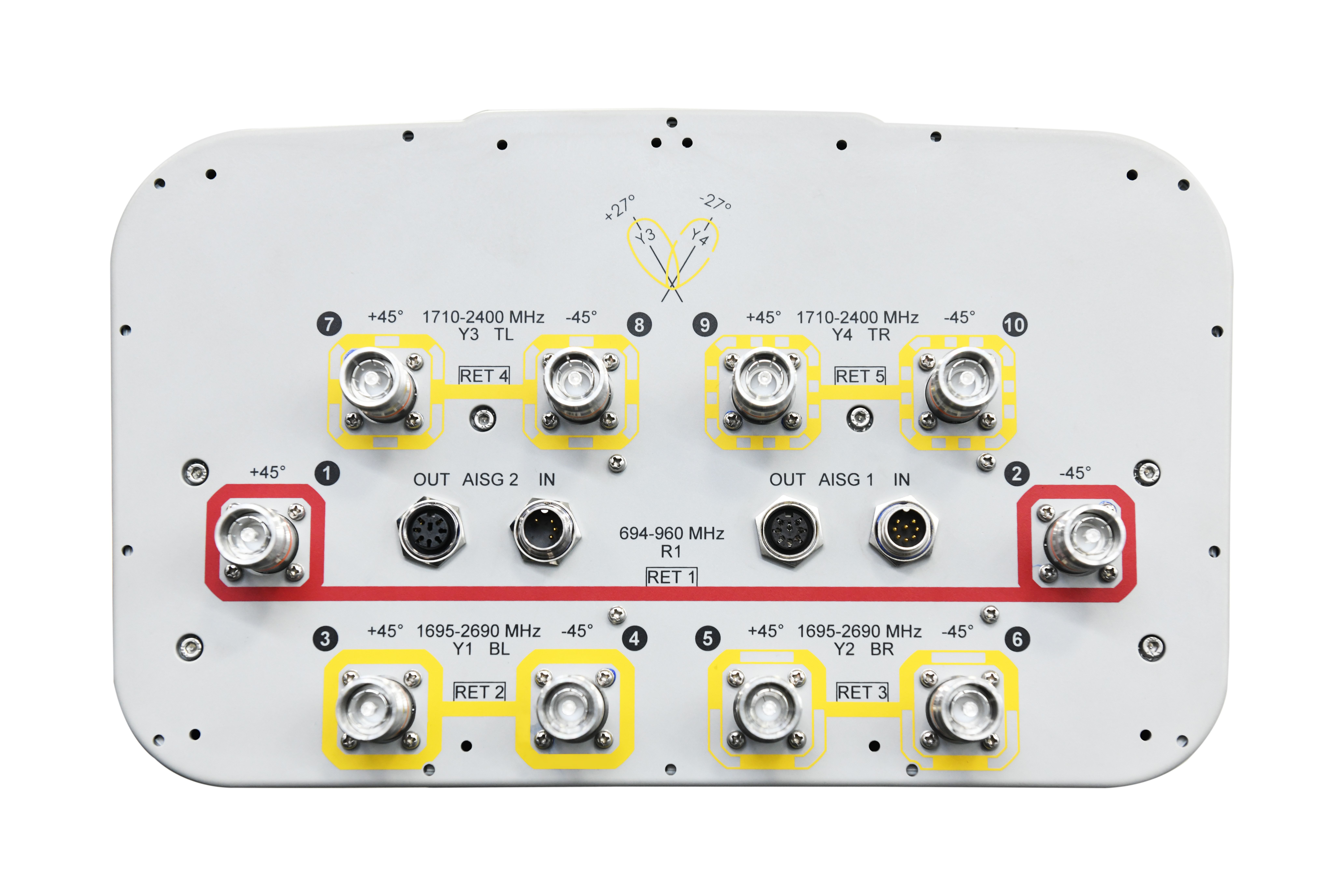 10-port sector antenna, 2x 694–960 and 4x 1695-2690 MHz 65° HPBW and 4x 1710-2400 MHz 2x 33° HPBW, 5x RET.