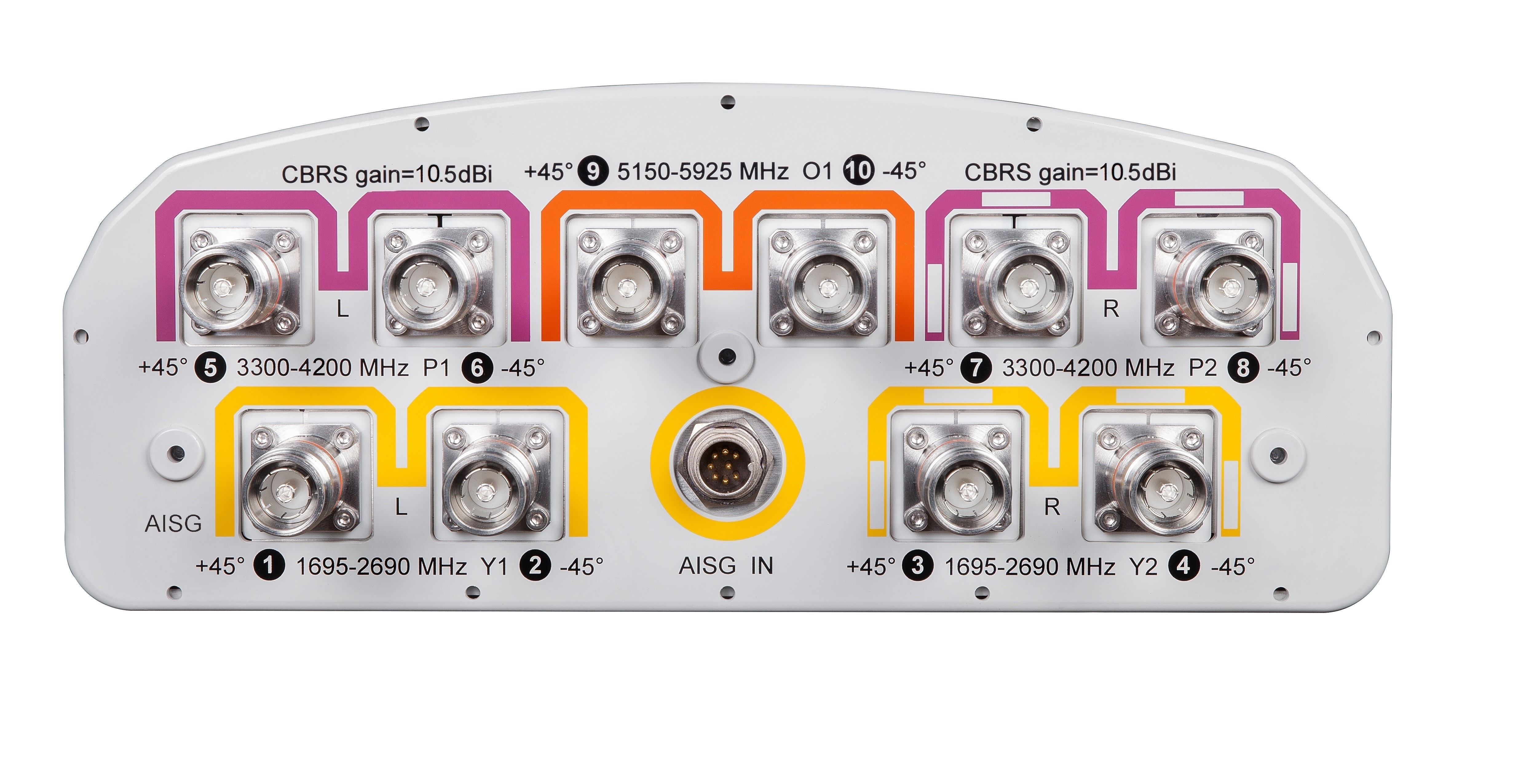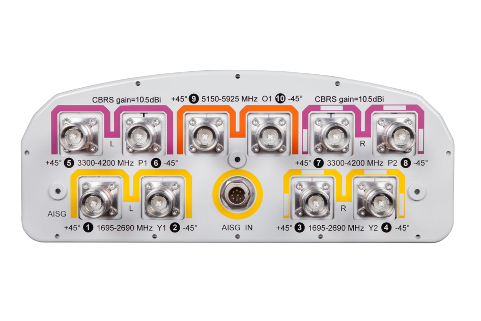 10-port small cell antenna, 4x 1695–2690, 4x 3300-4200 and 2x 5150-5925 MHz. 65° HPBW, Internal RET and SBT