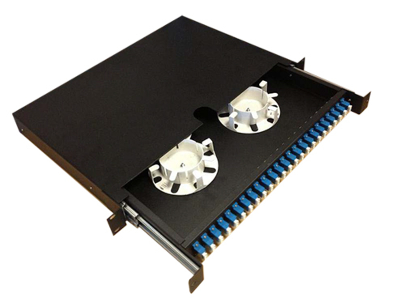 HELIAX® 24-port (48 fiber) patch panel for 19in cabinet, includes sliding Panel, 24 prepopulated singlemode adapters, 24 DLC-DLC single mode patch cords, 2 fiber tie