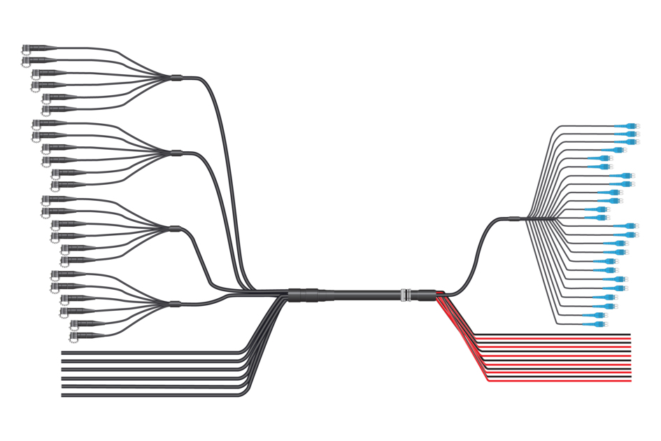 HELIAX® Direct-connect 6 x 24 hybrid trunk assembly: 6 pairs of 4AWG DC conductors x 24 pairs of single mode fibers.