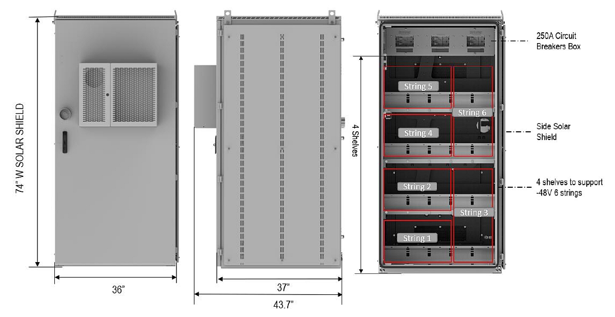 | Battery Storage | 4 battery shelves for holding up to 6 strings of -48V batteries |