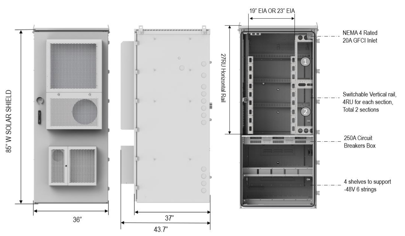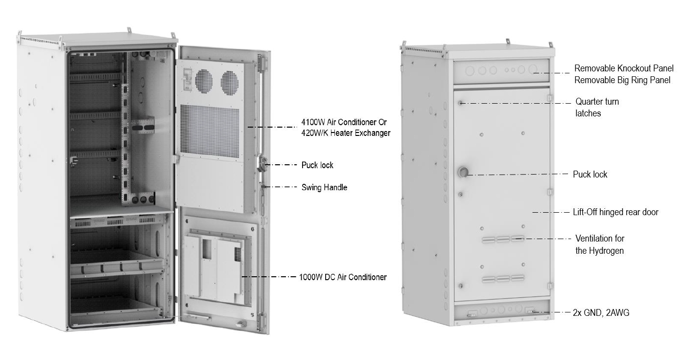 | Cooling | DC Rated 1000W Air Conditioner for Battery Compartment | DC Rated 4100W Air Conditioner Or 420W/k Thermosiphon unit for equipment compartment |