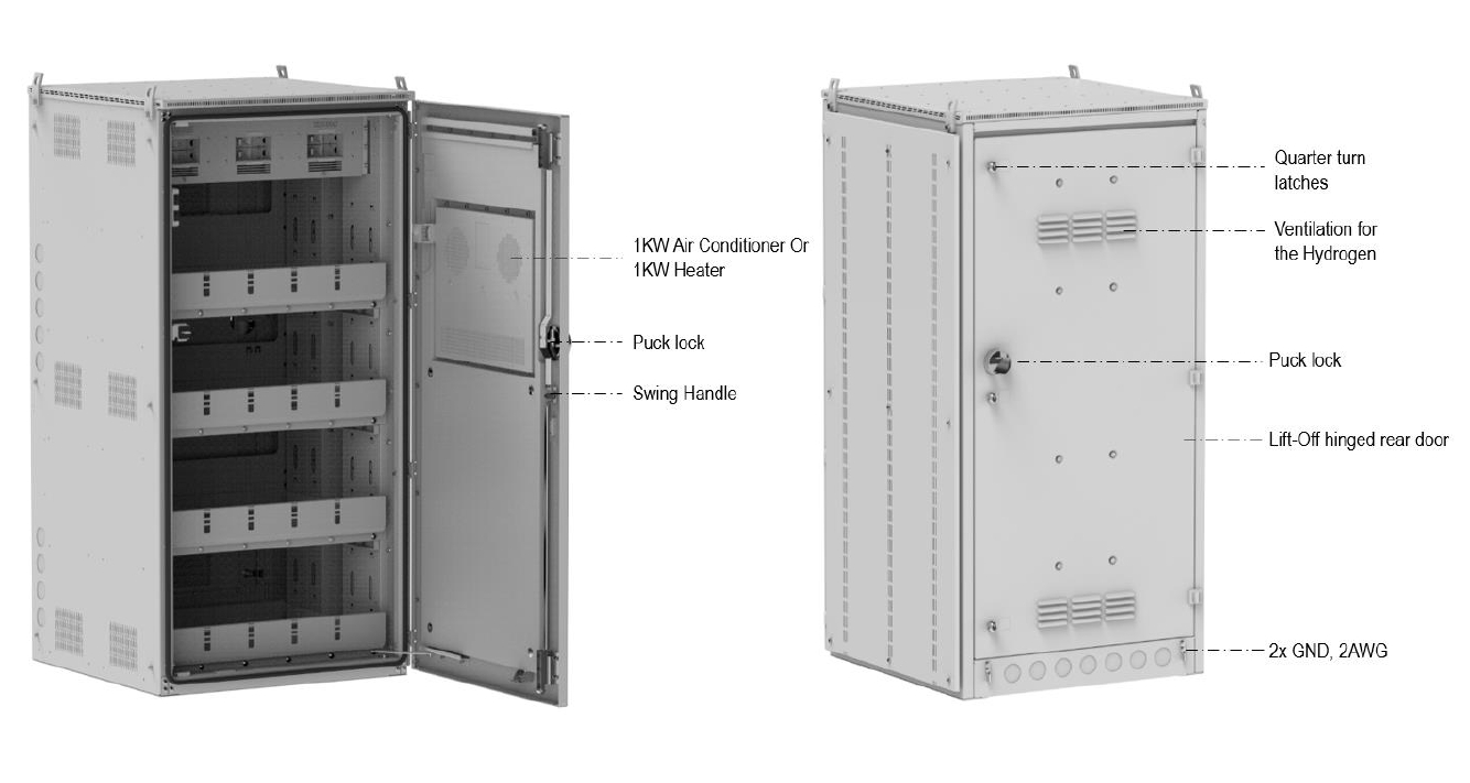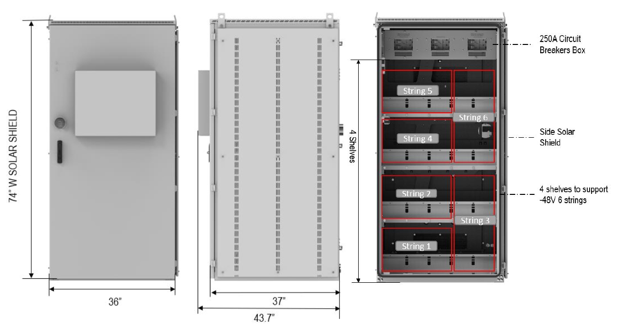 The cabinet is designed to accommodate 6 strings of -48V NiCad batteries into one cabinet. This cabinet provides mechanical and environmental protection for the equipment inside. The standard cabinet provides a 1000W heater on front door.