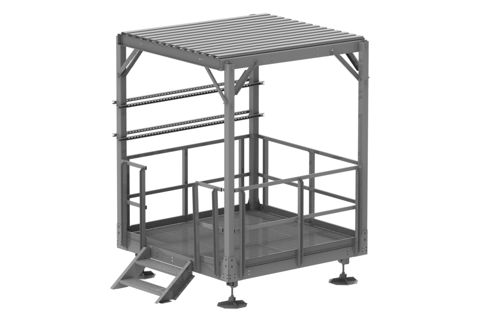 Equipment Platform, 8 ft x 8 ft, base with Canopy, Handrail, 2-Step Stairs, and four EQ-P-DF Weight Disbursement legs