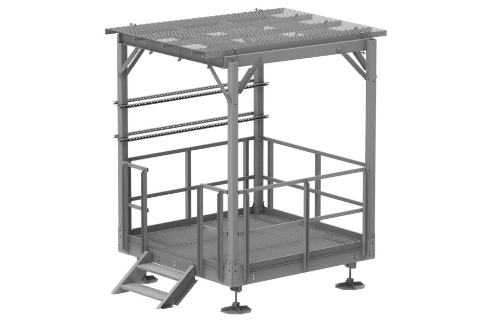 Equipment Platform, 8 ft x 8 ft, base with Ice Shield, Handrail, 2-Step Stairs, and four EQ-P-DF Weight Disbursement legs